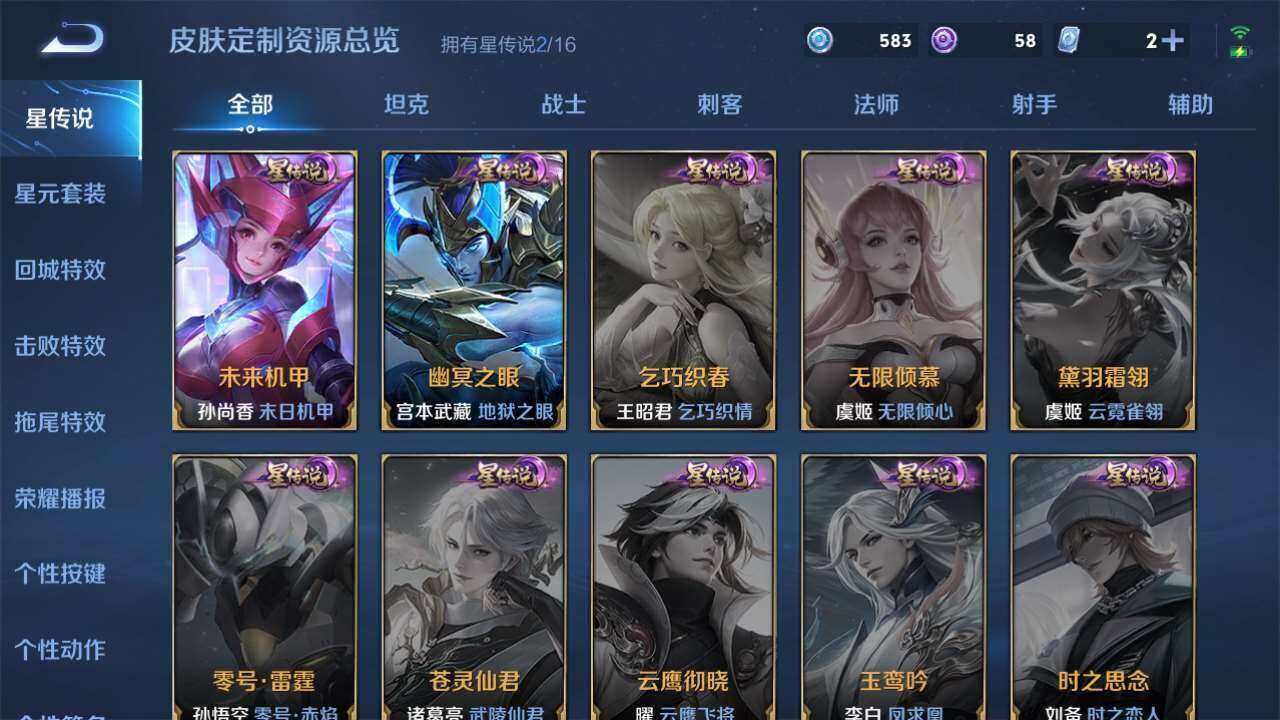 【限定皮肤】:白起狰,狄仁杰阴阳师,虞姬凯尔特女王,赵云皇家上将,赵云龙胆,墨子神迹守卫,嬴政白昼王子,鲁班七号狮舞东方,庄周蜃楼王,庄周高山流水,高渐离死亡摇滚,高渐离玩趣恶龙,阿轲迷踪丽影,钟无艳王者之锤,孙膑妖精王,扁鹊炼金王,芈月重明,芈月白晶晶,吕布猎兽之王,周瑜赤莲之焰,元歌云间偶戏,夏侯惇朔风刀,甄姬游园惊梦,曹操烛龙,典韦穷奇,典韦蓝屏警告,狄仁杰魔术师,狄仁杰万华元夜,达摩沙漠行僧,项羽海滩派对,老夫子醍醐杖,老夫子航海奇遇记,关羽冰锋战神,程咬金演武夺筹,刘邦夺宝奇兵,韩信飞衡,兰陵王驯魔猎人,兰陵王金庭之子,亚瑟潮玩骑士王,孙悟空至尊宝,牛魔御旌,后羿如梦令,李元芳银河之约,李元芳云中旅人,虞姬启明星使,钟馗神迹守卫,钟馗驱傩正仪,杨玉环遇见飞天,女娲朔望之晖,干将莫邪胡桃夹子,太乙真人饕餮,鬼谷子原初探秘者,鬼谷子五谷丰年,苏烈千军破阵,百里玄策原初追逐者,弈星混沌棋,沈梦溪星空之诺,沈梦溪大漠名商,明世隐疑决卦,裴擒虎天狼狩猎者,裴擒虎李小龙,裴擒虎擒涛扼浪,狂铁御狮,米莱狄御霄,云中君纤云弄巧,盾山御銮,猪八戒猪悟能,上官婉儿梁祝,嫦娥暖冬兔眠,鲁班大师探海日志,桑启海盐诗旅,阿古朵江河有灵,张良古海寻踪,高渐离燃音魔法,妲己灵卜魔法,鬼谷子天穹祈灯,沈梦溪龙舞盛年,鲁班七号蔬乡物语,李元芳蔬乡物语