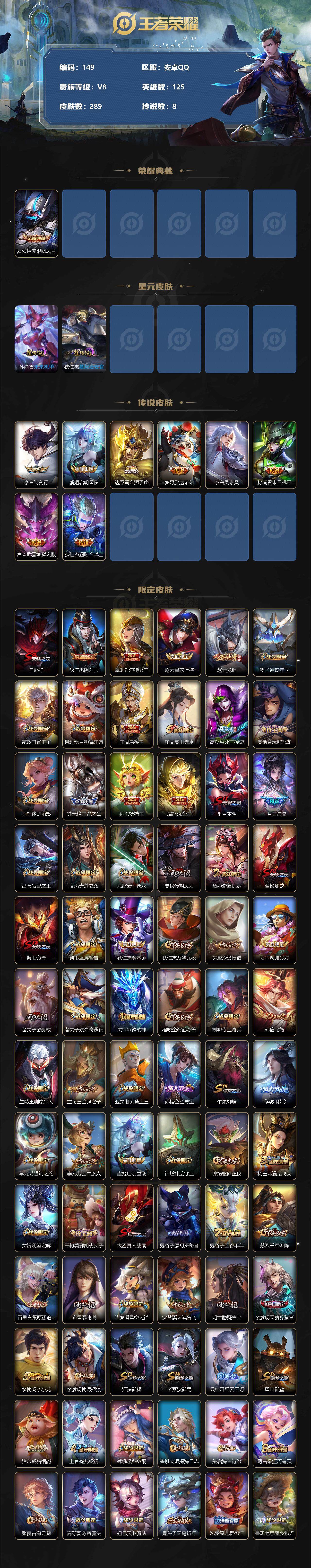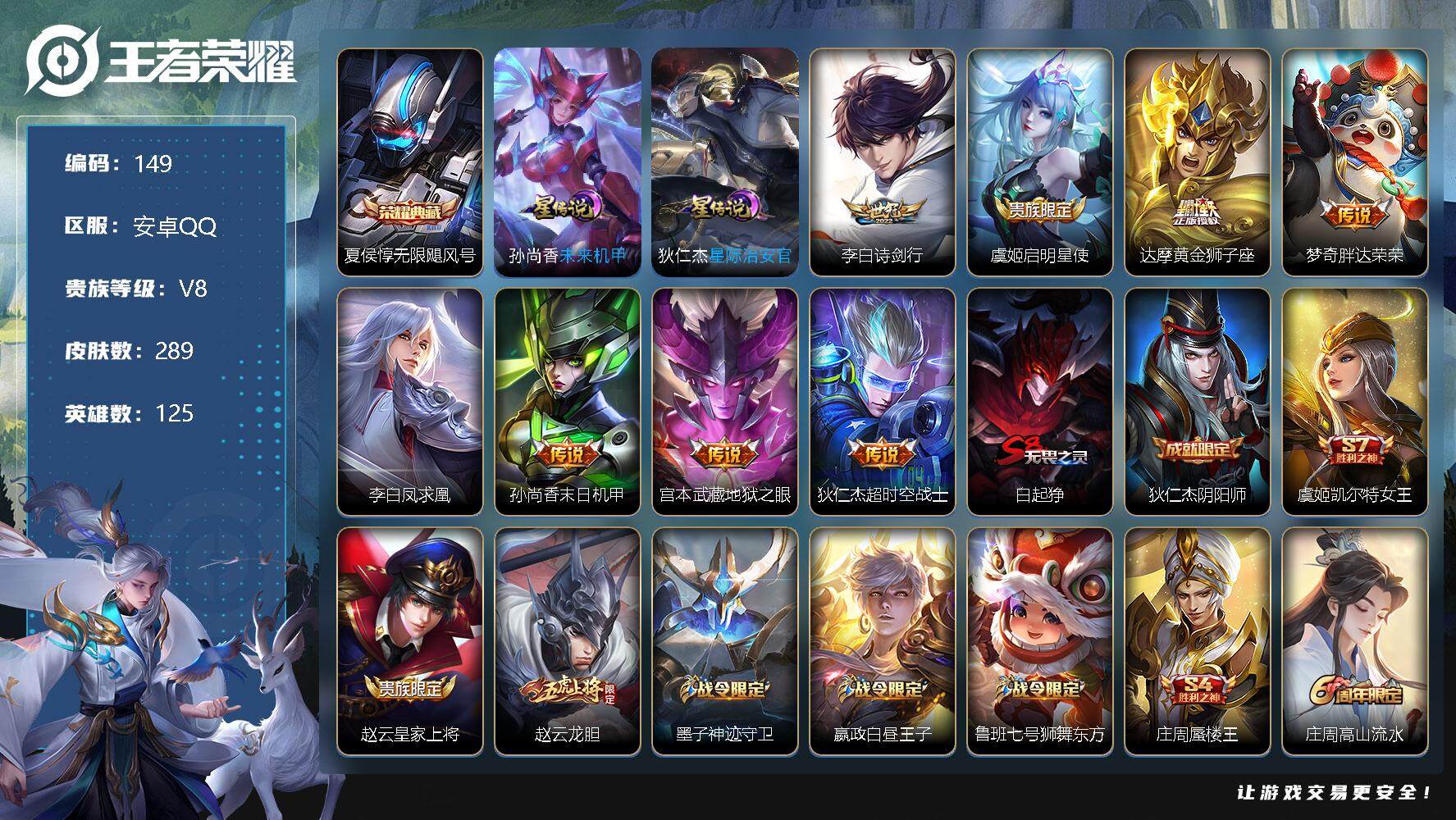 - [12025711]V8 1典藏 17传说 123英雄 280皮肤 可修改实名 连体和平 优质装备:鸣剑·曳影,黄金狮子座,云鹰飞将(小将军),猫影幻舞,一念神魔,云霓雀翎,仲夏夜之梦(大飞蛾),零号·赤焰,地狱之眼,时之恋人-刘备(电焊工),超时空战士-狄仁杰 珍宝阁皮:优雅恋人,玩趣恶龙 限定皮:鸣野蒿,至尊宝,白虎志(电光耗子),武陵仙君(小桃花),傲雪梅枪,补天,白晶晶,时雨天司(水龙头),神威(电光马子),飞衡(韩信年限),高山流水,五谷丰年,青龙志(铠年限),冰锋战神,天狼运算者,游园惊梦,梁祝,御风骁将(吕布年限),逐梦之星,虎魄,祈雪灵祝(雪兔子),李小龙,逐梦之影,默契交锋-花木兰,孙行者,大圣娶亲,冰霜恋舞曲,神奇女侠,百木心枪 史诗皮:紫霞仙子,苍穹之光,电玩小子(小书包),白龙吟,黄金分割率,特工魅影,千年之狐,永昼,电玩·爆裂旋风,江河有灵,高渐离燃音魔法,蒙恬荣光圣徽,偶像歌手,暗夜猫娘,魅语,晚萤,末日机甲-吕布,猫狗日记-孙策,时之恋人-孙尚香,乱世虎臣,节奏热浪,修罗,女仆咖啡,摇滚巨星,水果甜心,天才门将,星夜王子,心灵骇客,功夫厨神,暗隐猎兽者,幽灵船长,鬼剑武藏,暗渊魔法,心灵战警,舞动绿茵,地狱岩魂,纤云弄巧,繁星吟游(呼啦呼啦),拒霜思,缤纷独角兽,乘风破浪,逐浪之夏,水晶猎龙者,曙光守护者,金属风暴,原初追逐者,圣诞狂欢,圣诞恋歌,鹰眼统帅,暗夜贵公子,魅力维加斯,黎明之约,无心