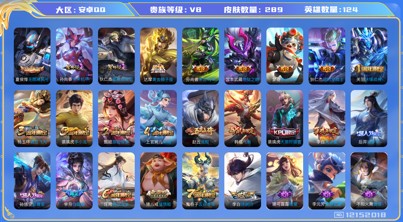 [12152018]MQ057-有二次-安卓Q-V8-125英雄-289皮肤-1典藏-8传说-77史诗