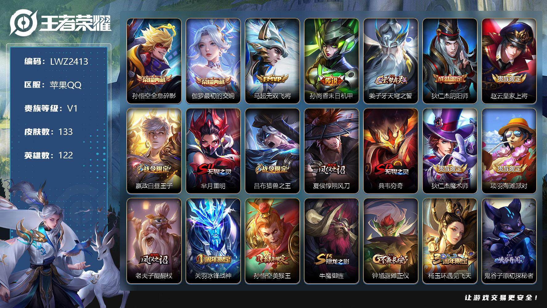 [12106107]【特价急出/详情看图】:苹果Q-V1-最强王者段位-122英雄-133皮肤-2典藏-2传说-36史诗 【荣耀典藏】:孙悟空全息碎影,伽罗最初的交响 【传说皮肤】:马超无双飞将,孙尚香末日机甲 【限定皮肤】:姜子牙天穹之誓,狄仁杰阴阳师,赵云皇家上将,嬴政白昼王子,芈月重明,吕布猎兽之王,夏侯惇朔风刀,典韦穷奇,狄仁杰魔术师,项羽海滩派对,老夫子醍醐杖,关羽冰锋战神,孙悟空美猴王,牛魔御旌,钟馗驱傩正仪,杨玉环遇见飞天,鬼谷子原初探秘者,弈星混沌棋,明世隐疑决卦,裴擒虎李小龙,狂铁御狮,米莱狄御霄,盾山御銮,上官婉儿梁祝 【年限皮肤】:孙悟空美猴王 【赛季限定】:芈月重明,夏侯惇朔风刀,典韦穷奇,老夫子醍醐杖,牛魔御旌,钟馗驱傩正仪,鬼谷子原初探秘者,弈星混沌棋,明世隐疑决卦,狂铁御狮,米莱狄御霄,盾山御銮,姜子牙天穹之誓 【战令限定】:嬴政白昼王子,吕布猎兽之王 【史诗皮肤】:露娜紫霞仙子,赵云皇家上将,赵云未来纪元,貂蝉圣诞恋歌,王昭君偶像歌手,狄仁杰魔术师,宫本武藏鬼剑武藏,嬴政暗夜贵公子,吕布圣诞狂欢,曹操幽灵船长,李白千年之狐,关羽冰锋战神,花木兰水晶猎龙者,刘邦德古拉伯爵,夏侯惇乘风破浪,小乔缤纷独角兽,兰陵王暗隐猎兽者,诸葛亮黄金分割率,雅典娜冰冠公主,百里守约特工魅影,铠曙光守护者,刘禅天才门将,李元芳逐浪之夏,杨玉环遇见飞天,嬴政白昼王子,伽罗箭羽风息,狄仁杰鹰眼统帅,上官婉儿梁祝,不知火舞魅语,裴擒虎李小龙,哪吒雪上飞焰,夏洛特永昼,艾琳奇遇舞章,高渐离天秀音浪,百里守约百相守梦,孙膑茶境仙 【其他皮肤】:项羽海滩派对,韩信教廷特使,韩信街头霸王,露娜哥特玫瑰,阿轲爱心护理,扁鹊化身博士,宫本武藏未来纪元,安琪拉玩偶对对碰,妲己少女阿狸,典韦黄金武士,达摩拳王,孙悟空美猴王,花木兰兔女郎,甄姬花好人间,刘备万事如意,狄仁杰阴阳师,刘备汉昭烈帝,关羽龙腾万里,钟无艳海滩丽影,芈月重明,老夫子功夫老勺,孙尚香沉稳之力,典韦穷奇,李白敏锐之力,鬼谷子幻乐之宴,狂铁御狮,项羽科学大爆炸,米莱狄御霄,吕布猎兽之王,张良幽兰居士,牛魔御旌,盾山御銮,夏侯惇朔风刀,弈星混沌棋,哪吒次元突破,明世隐疑决卦,盾山圆桌骑士,老夫子醍醐杖,鬼谷子原初探秘者,钟馗驱傩正仪,鲁班大师乓乓大师,蒙恬蔚蓝守将,猪八戒潮玩探月行,姬小满零食大作战,姜子牙天穹之誓,东皇太一噬灭天