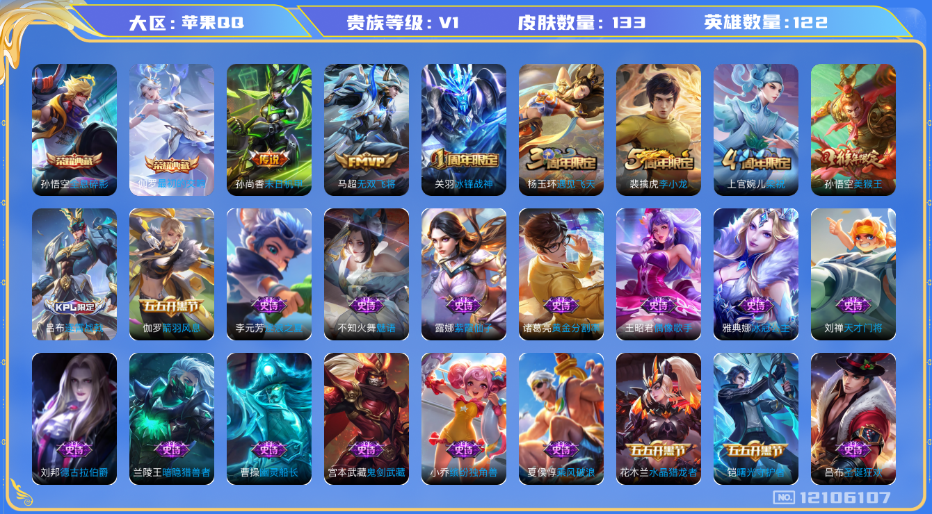 - [12277718]V8 1典藏 1无双 2珍品传说 12传说 123英雄 323皮肤 可修改实名 优质装备:鸣剑·曳影,器灵·螭龙剑,怪盗基德,黑崎一护,黄金狮子座,云鹰飞将(小将军),炽阳神光,末日机甲-孙尚香(绿蚂蚱),地狱之眼,无双飞将,涂山容容 珍宝阁皮:妄想食味,玩趣恶龙 限定皮:愿照·九州拓(澜年限),愿照·山河定(司空震年限),逐霄战戟,鸣野蒿,至尊宝,傲雪梅枪,神威(电光马子),高山流水,诗剑行,五谷丰年,游园惊梦,李小龙,一生所爱,匿光追影者,寅虎·赤拳(老虎年限),山海·玄木吟(马可年限) 史诗皮:鸭鸭历险记-刘禅,器灵·浮梦炉,化蝶舞,星界战将,谪仙醉月,龙之律动,石田雨龙,百相守梦-周瑜,茶境仙,破空之剑,战舞者,东方月初,蒙犽顽岩魄,埋骨钱,蔬乡物语(鲁班七号),超元猎域,百相守梦-百里守约,百相守梦-黄忠,织梦人,紫霞仙子,苍穹之光,黄金分割率,特工魅影,千年之狐,永昼,江河有灵,魅语,百解令(蒙犽),高渐离燃音魔法,蒙恬荣光圣徽,无限星赏官,冰冠公主,晚萤,电玩·爆裂旋风,末日机甲-吕布,乱世虎臣,节奏热浪,修罗,女仆咖啡,摇滚巨星,水果甜心,绅士熊喵,天才门将,星夜王子,心灵骇客,功夫厨神,暗隐猎兽者,幽灵船长,鬼剑武藏,暗渊魔法,乐园奇幻夜,舞动绿茵,地狱岩魂,纤云弄巧,拒霜思,缤纷独角兽,乘风破浪,逐浪之夏,月团寄思,水晶猎龙者,曙光守护者,热力回旋,箭羽风息,金属风暴,原初追逐者,圣诞狂欢,圣诞恋歌,鹰眼统帅,暗夜贵公子,魅力维加斯,黎明之约,赏金猎手,无心