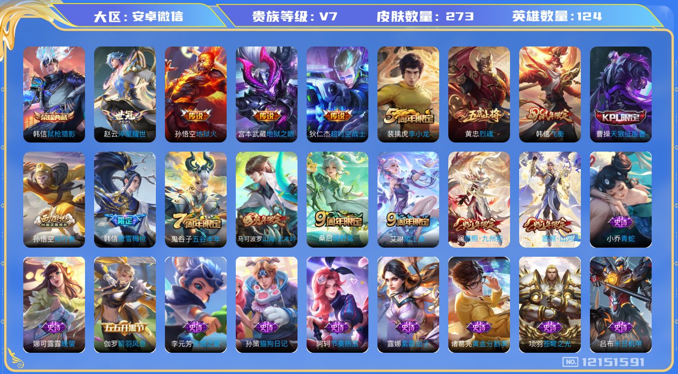[12151591]【商品标题】:AK526-安卓WX-V7-至尊星耀II段位-125英雄-273皮肤-1典藏-0珍品无双-0无双-0珍品传说-7传说-85史诗