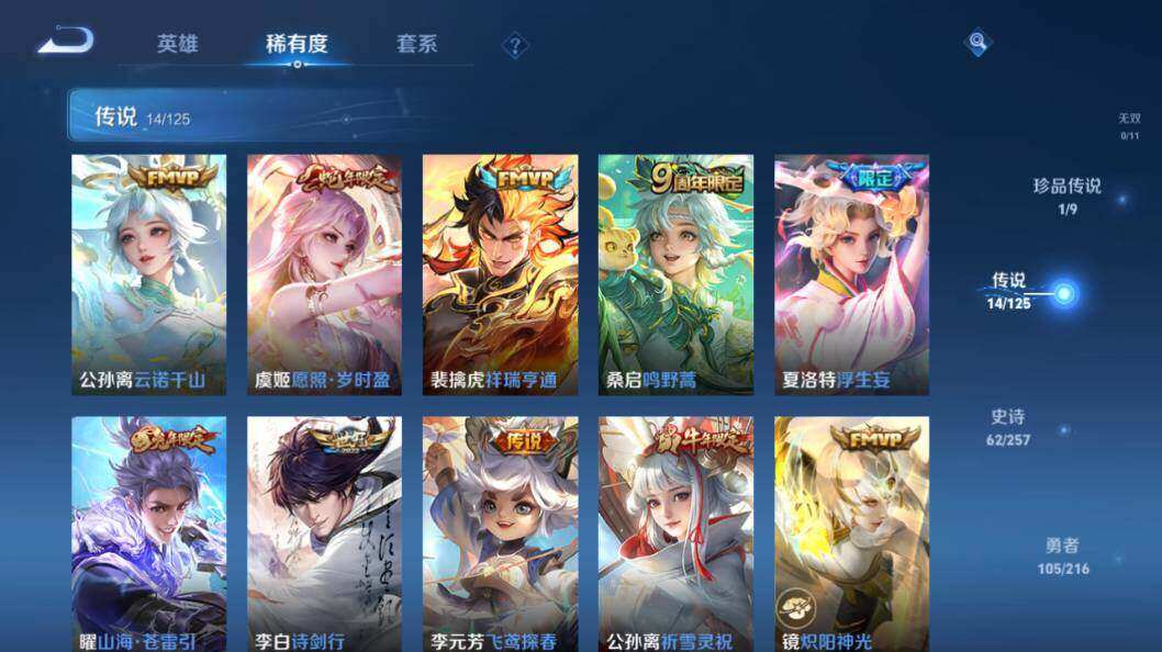 【传说皮肤】:公孙离云诺千山,虞姬愿照岁时盈,裴擒虎祥瑞亨通,桑启鸣野蒿,夏洛特浮生妄,曜山海苍雷引,李白诗剑行,李元芳飞鸢探春,公孙离祈雪灵祝,镜炽阳神光,曜云鹰飞将,李信一念神魔,干将莫邪久胜战神,孙尚香末日机甲