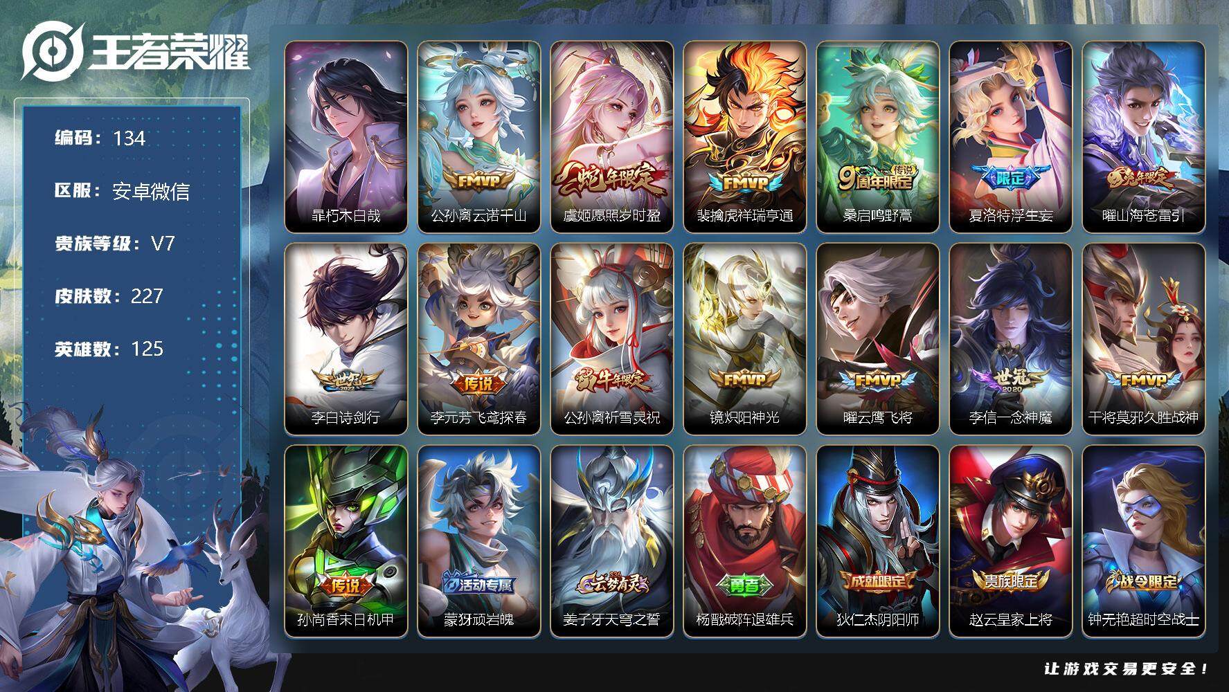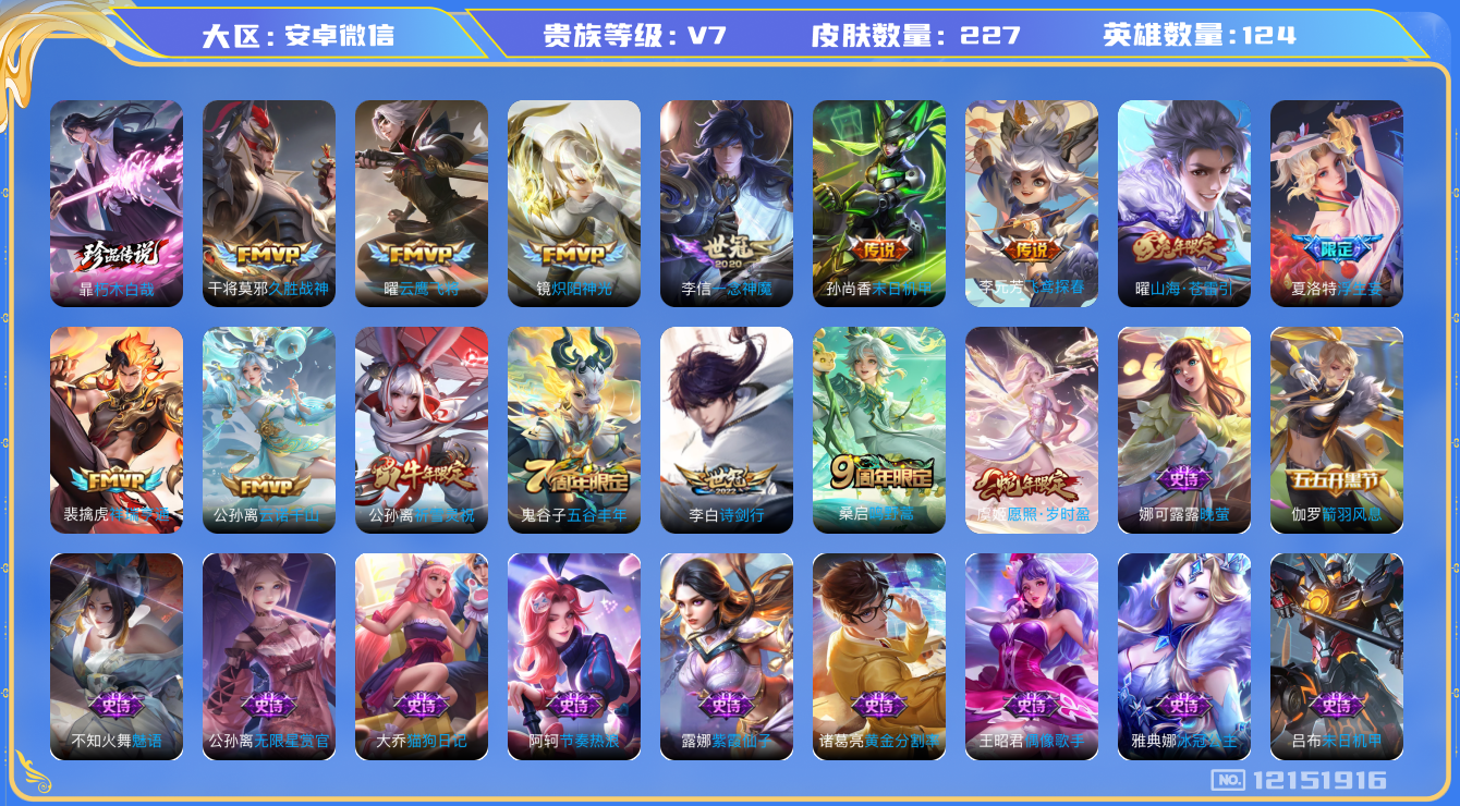 [12151916]AK644 :安卓WX-V7-最强王者段位-125英雄-227皮肤-0典藏-0珍品无双-0无双-1珍品传说-14传说-63史诗