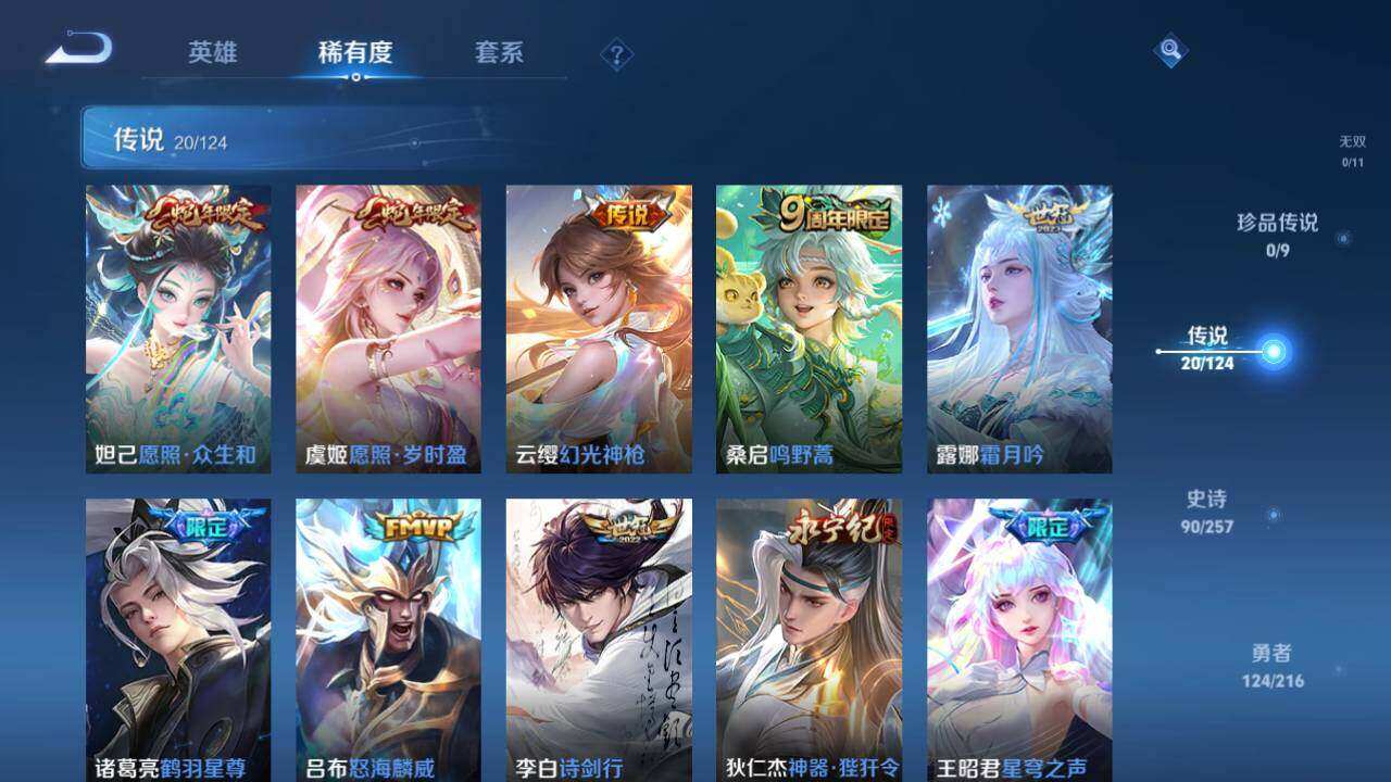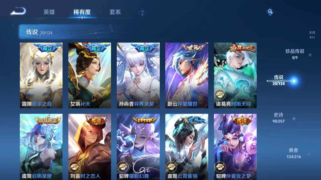 【传说皮肤】:妲己愿照众生和,虞姬愿照岁时盈,云缨幻光神枪,桑启鸣野蒿,露娜霜月吟,诸葛亮鹤羽星尊,吕布怒海麟威,李白诗剑行,狄仁杰神器狴犴令,王昭君星穹之声,露娜启示之音,女娲补天,孙尚香异界灵契,赵云淬星耀世,诸葛亮时雨天司,虞姬启明星使,刘备时之恋人,貂蝉猫影幻舞,虞姬云霓雀翎,貂蝉仲夏夜之梦