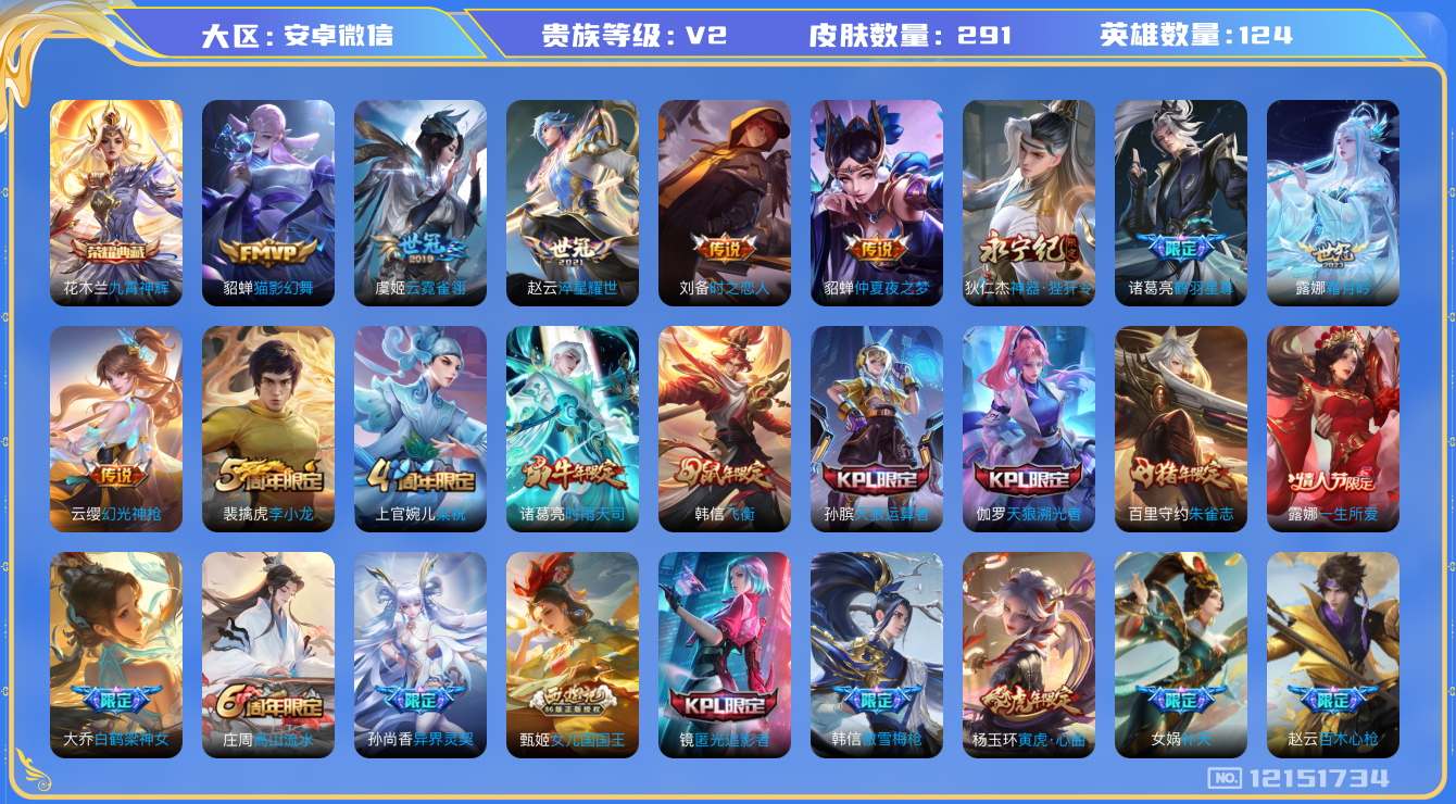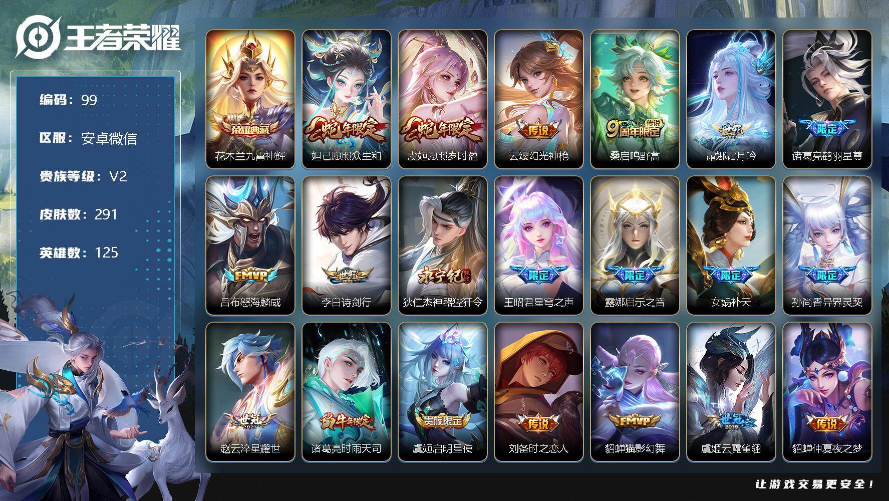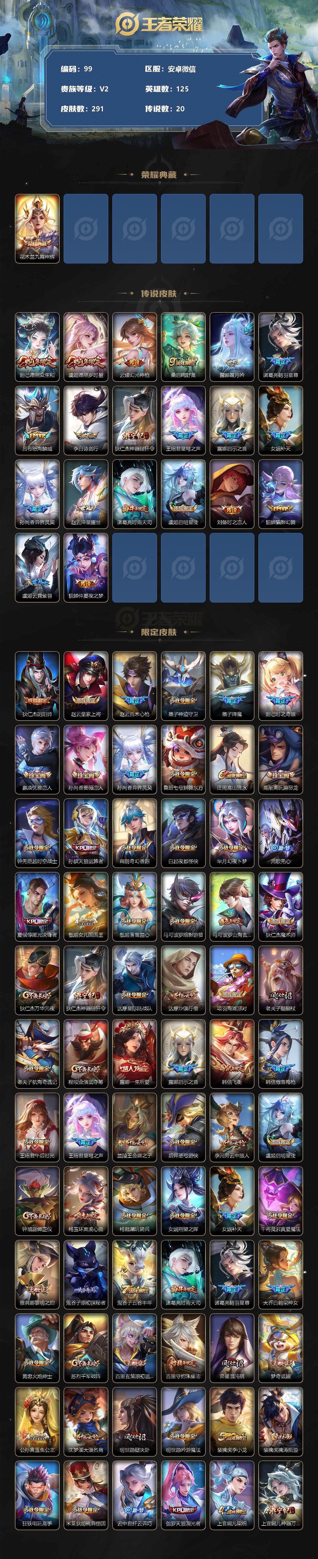 [12151734]【商品标题】:安卓WX-V2-最强王者段位-125英雄-291皮肤-1典藏-0珍品无双-0无双-0珍品传说-20传说-90史诗