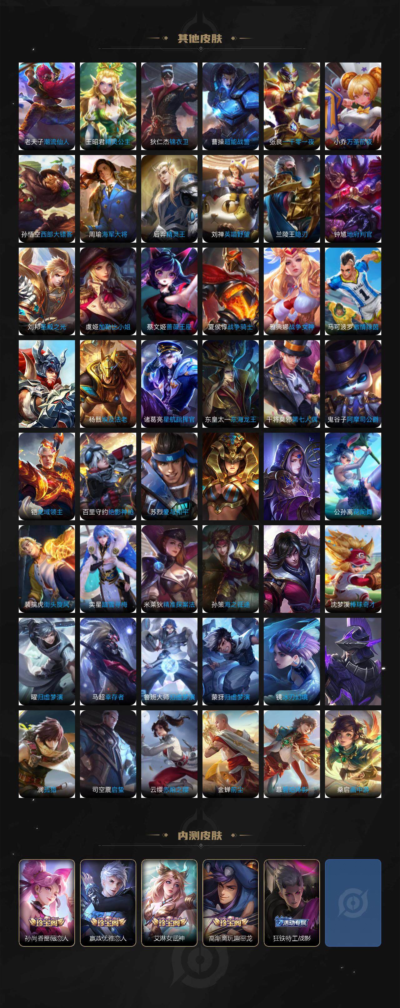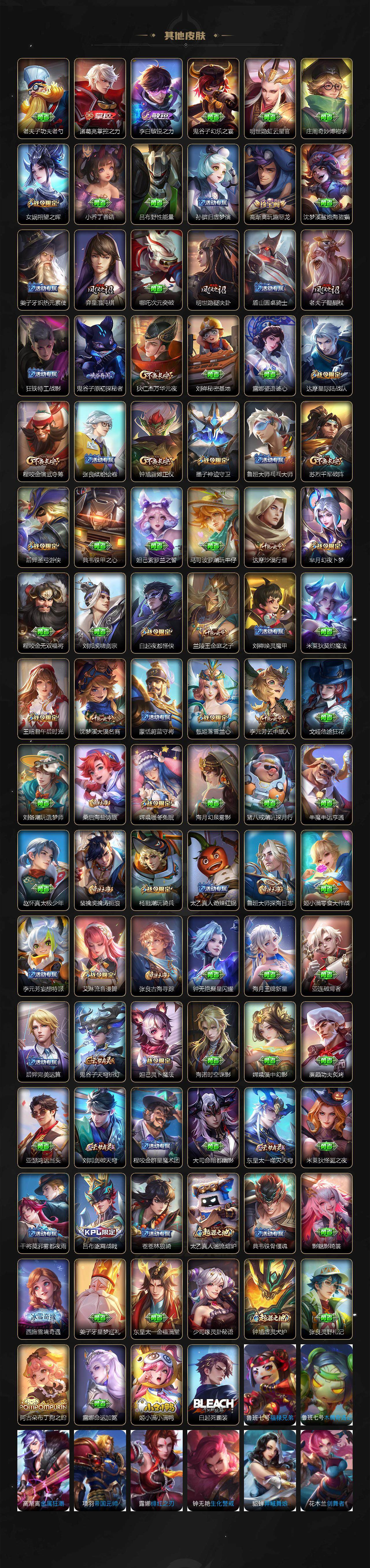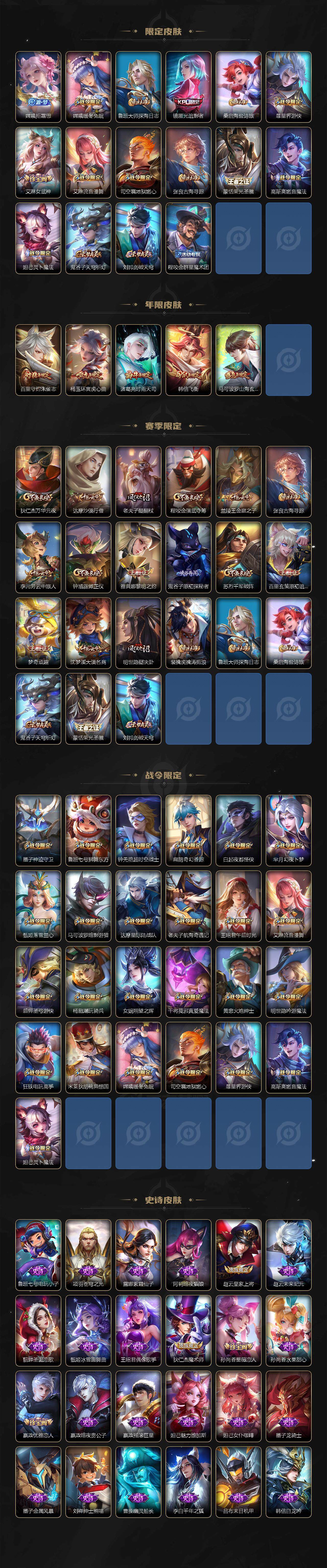 【限定皮肤】:狄仁杰阴阳师,赵云皇家上将,赵云百木心枪,墨子神迹守卫,墨子降魔,妲己时之奇旅,嬴政优雅恋人,孙尚香蔷薇恋人,孙尚香异界灵契,鲁班七号狮舞东方,庄周高山流水,高渐离玩趣恶龙,钟无艳超时空战士,孙膑天狼运算者,扁鹊奇幻香踪,白起夜都怪侠,芈月幻夜卜梦,元歌无心,夏侯惇匿光决锋者,甄姬女儿国国王,甄姬落雪兰心,马可波罗暗影游猎,马可波罗山海玄木吟,狄仁杰魔术师,狄仁杰万华元夜,狄仁杰神器狴犴令,达摩星际陆战队,达摩沙漠行僧,项羽海滩派对,老夫子醍醐杖,老夫子航海奇遇记,程咬金演武夺筹,露娜一生所爱,露娜启示之音,韩信飞衡,韩信傲雪梅枪,王昭君午后时光,王昭君星穹之声,兰陵王金庭之子,后羿圣弓游侠,李元芳云中旅人,虞姬启明星使,钟馗驱傩正仪,杨玉环寅虎心曲,杨戬潮玩骑兵,女娲朔望之晖,女娲补天,干将莫邪真爱魔法,雅典娜黎明之约,鬼谷子原初探秘者,鬼谷子五谷丰年,诸葛亮时雨天司,诸葛亮鹤羽星尊,大乔白鹤梁神女,黄忠火炮绅士,苏烈千军破阵,百里玄策原初追逐者,百里守约朱雀志,弈星混沌棋,梦奇顽趣,公孙离玉兔公主,沈梦溪大漠名商,明世隐疑决卦,明世隐吟游魔法,裴擒虎李小龙,裴擒虎擒涛扼浪,狂铁电玩高手,米莱狄胡桃异想国,云中君纤云弄巧,伽罗天狼溯光者,上官婉儿梁祝,上官婉儿神器万象笔,嫦娥拒霜思,嫦娥暖冬兔眠,鲁班大师探海日志,镜匿光追影者,桑启海盐诗旅,暃星界游侠,艾琳女武神,艾琳流音漫舞,司空震地狱燃心,张良古海寻踪,蒙恬荣光圣徽,高渐离燃音魔法,妲己灵卜魔法,鬼谷子天穹祈灯,刘邦剑破天穹,程咬金群星魔术团