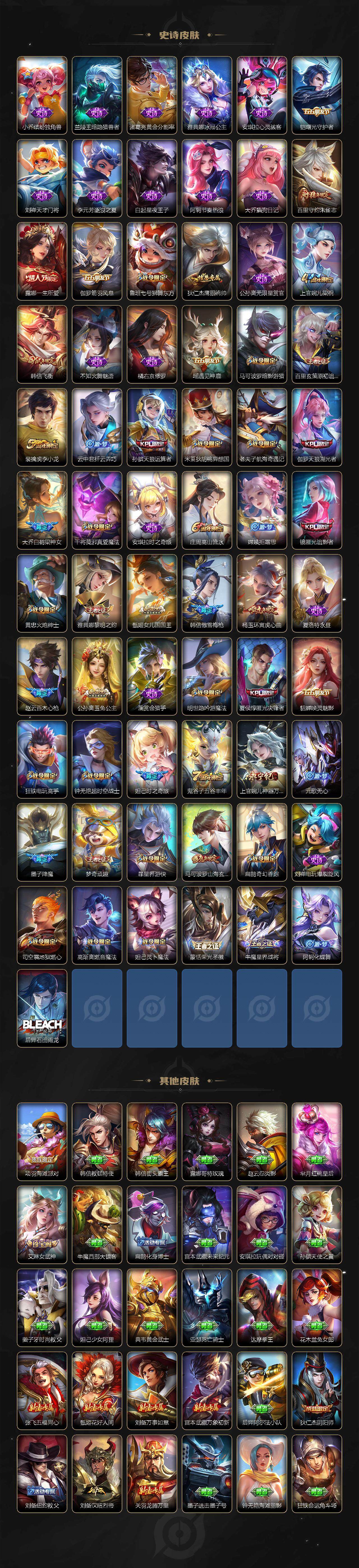 - [12315555]V7 11传说 124英雄 288皮肤 可修改实名 优质装备:云鹰飞将(小将军),猫影幻舞,久胜战神,地狱火,地狱之眼,无双飞将,澜逐花归海 传说皮:祥瑞亨通 珍宝阁皮:妄想食味,玩趣恶龙 限定皮:愿照·九州拓(澜年限),鸣野蒿,至尊宝,白虎志(电光耗子),神威(电光马子),遇见飞天,高山流水,五谷丰年,游园惊梦,梁祝,逐梦之星,李小龙,逐梦之影,朱雀志(守约年限),霸王别姬-项羽,乒乒小将,蜜橘之夏 史诗皮:化蝶舞,星界战将,石田雨龙,怒海争锋,蒙犽顽岩魄,芈月浮光幕影,琥珀纪元伽罗,蔬乡物语(鲁班七号),百相守梦-黄忠,紫霞仙子,电玩小子(小书包),白龙吟,黄金分割率,特工魅影,千年之狐,江河有灵,百解令(蒙犽),蒙恬荣光圣徽,无限星赏官,冰冠公主,青蛇,偶像歌手,晚萤,电玩·爆裂旋风,猫狗日记-孙策,猫狗日记-大乔,时之恋人-孙尚香,乱世虎臣,节奏热浪,修罗,女仆咖啡,摇滚巨星,水果甜心,绅士熊喵,星夜王子,心灵骇客,暗隐猎兽者,幽灵船长,鬼剑武藏,舞动绿茵,纤云弄巧,繁星吟游(呼啦呼啦),拒霜思,缤纷独角兽,逐浪之夏,水晶猎龙者,曙光守护者,金属风暴,原初追逐者,圣诞狂欢,鹰眼统帅,黎明之约,无心