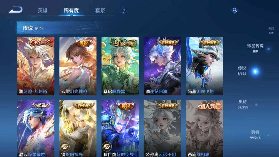 【传说皮肤】:澜愿照九州拓,云缨幻光神枪,桑启鸣野蒿,澜逐花归海,马超无双飞将,赵云淬星耀世,镜炽阳神光,狄仁杰超时空战士