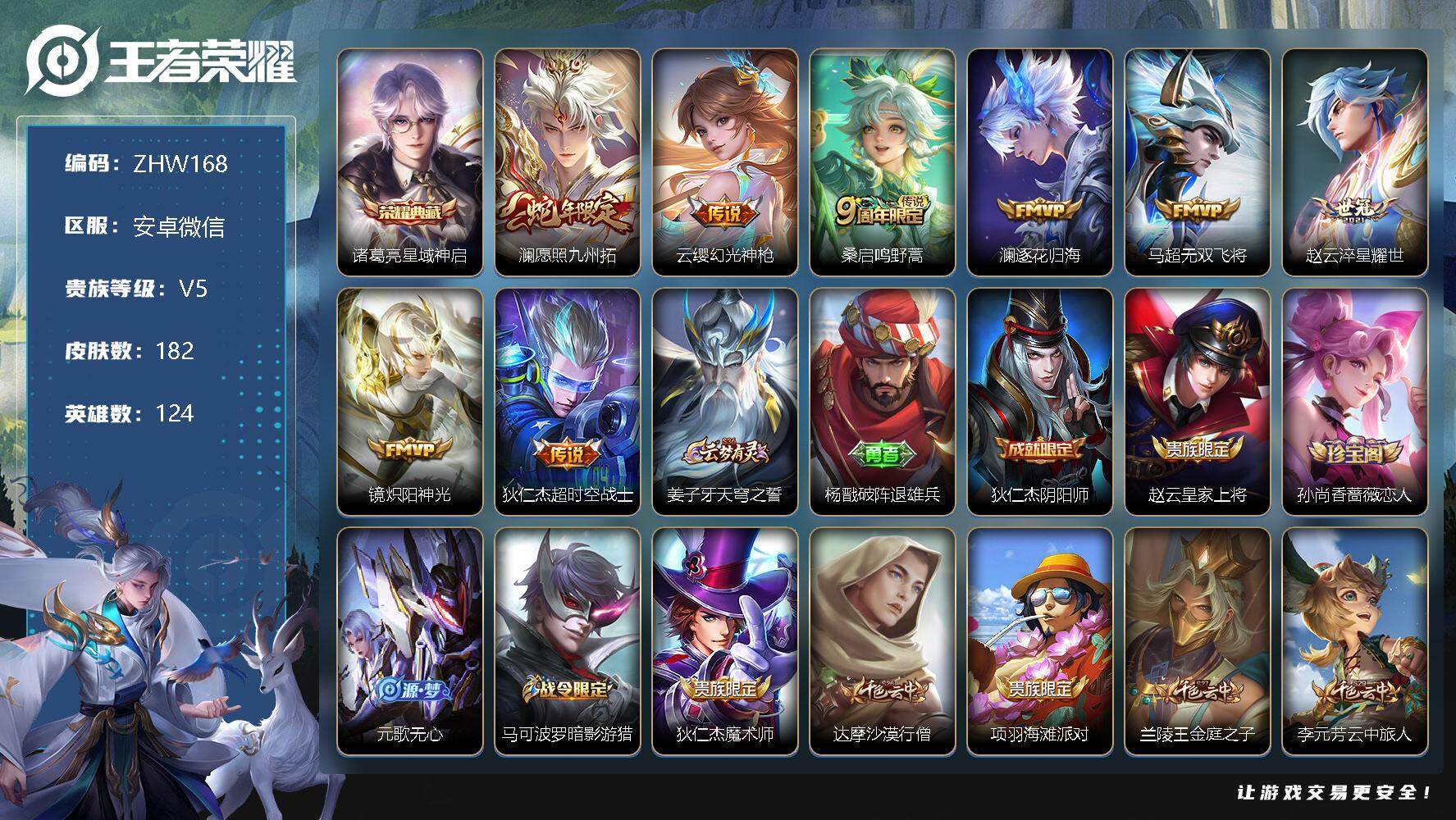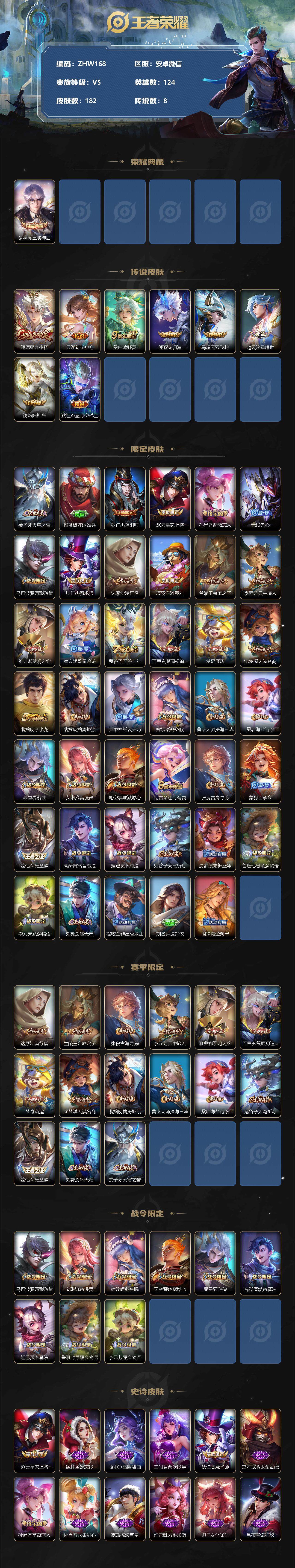 [12152168]【商品标题】:安卓WX-V5-永恒钻石IV段位-124英雄-182皮肤-1典藏-0珍品无双-0无双-0珍品传说-8传说-52史诗
