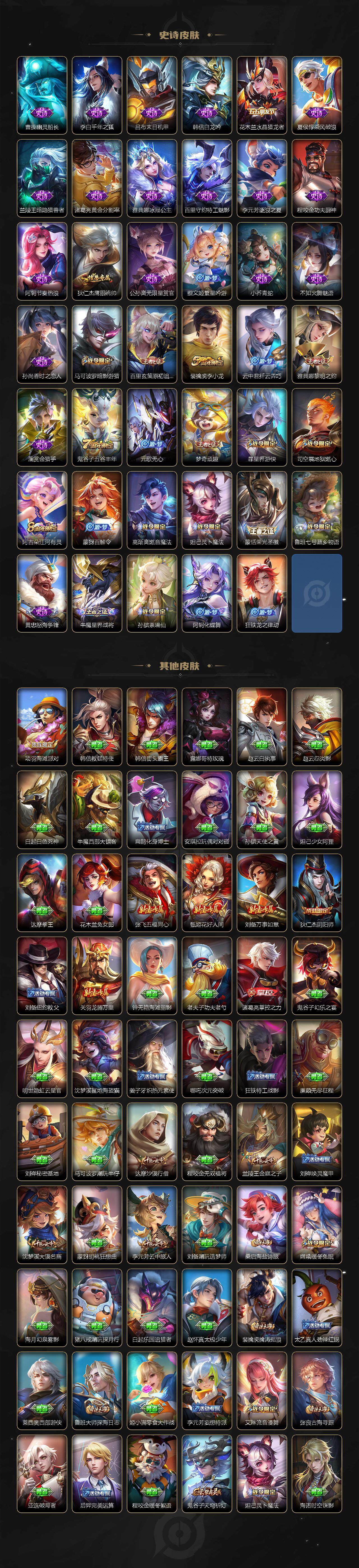 【史诗皮肤】:赵云皇家上将,貂蝉圣诞恋歌,甄姬冰雪圆舞曲,王昭君偶像歌手,狄仁杰魔术师,宫本武藏鬼剑武藏,孙尚香蔷薇恋人,孙尚香水果甜心,嬴政摇滚巨星,妲己魅力维加斯,妲己女仆咖啡,吕布圣诞狂欢,曹操幽灵船长,李白千年之狐,吕布末日机甲,韩信白龙吟,花木兰水晶猎龙者,夏侯惇乘风破浪,兰陵王暗隐猎兽者,诸葛亮黄金分割率,雅典娜冰冠公主,百里守约特工魅影,李元芳逐浪之夏,程咬金功夫厨神,阿轲节奏热浪,狄仁杰鹰眼统帅,公孙离无限星赏官,蔡文姬繁星吟游,小乔青蛇,不知火舞魅语,孙尚香时之恋人,马可波罗暗影游猎,百里玄策原初追逐者,裴擒虎李小龙,云中君纤云弄巧,雅典娜黎明之约,澜赏金猎手,鬼谷子五谷丰年,元歌无心,梦奇顽趣,暃星界游侠,司空震地狱燃心,阿古朵江河有灵,蒙犽百解令,妲己灵卜