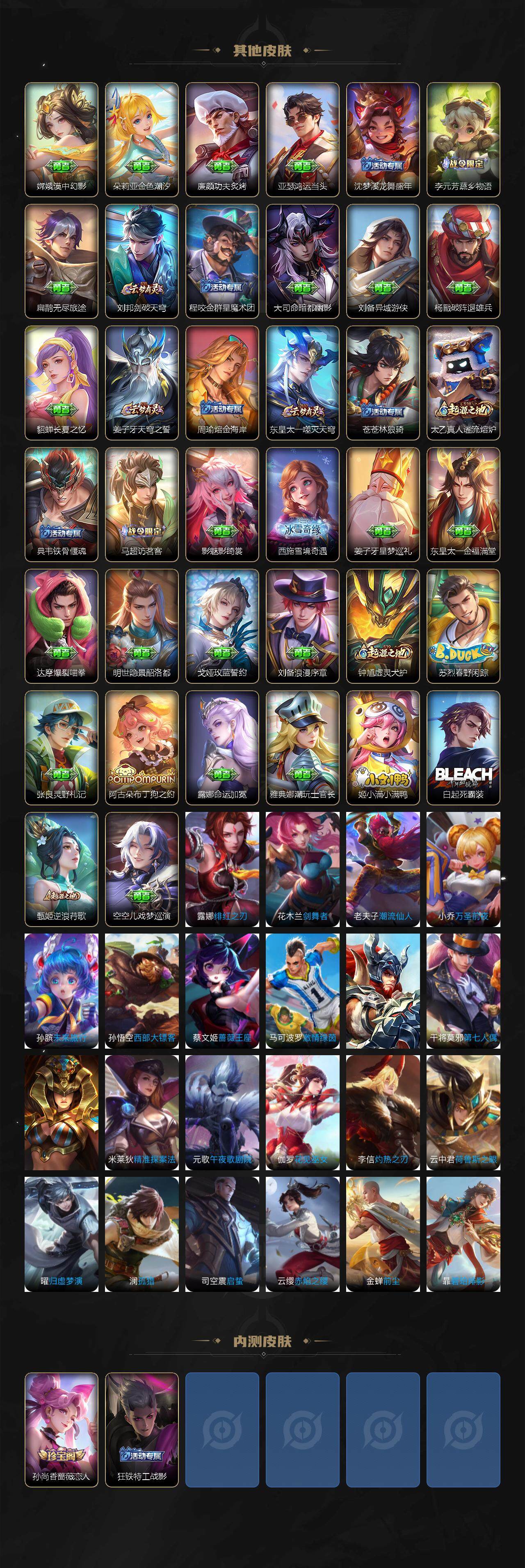 【限定皮肤】:姜子牙天穹之誓,杨戬破阵退雄兵,狄仁杰阴阳师,赵云皇家上将,孙尚香蔷薇恋人,元歌无心,马可波罗暗影游猎,狄仁杰魔术师,达摩沙漠行僧,项羽海滩派对,兰陵王金庭之子,李元芳云中旅人,雅典娜黎明之约,蔡文姬繁星吟游,鬼谷子五谷丰年,百里玄策原初追逐者,梦奇顽趣,沈梦溪大漠名商,裴擒虎李小龙,裴擒虎擒涛扼浪,云中君纤云弄巧,嫦娥暖冬兔眠,鲁班大师探海日志,桑启海盐诗旅,暃星界游侠,艾琳流音漫舞,司空震地狱燃心,阿古朵江河有灵,张良古海寻踪,蒙犽百解令,蒙恬荣光圣徽,高渐离燃音魔法,妲己灵卜魔法,鬼谷子天穹祈灯,沈梦溪龙舞盛年,鲁班七号蔬乡物语,李元芳蔬乡物语,刘邦剑破天穹,程咬金群星魔术团,刘备异域游侠,周瑜熔金海岸