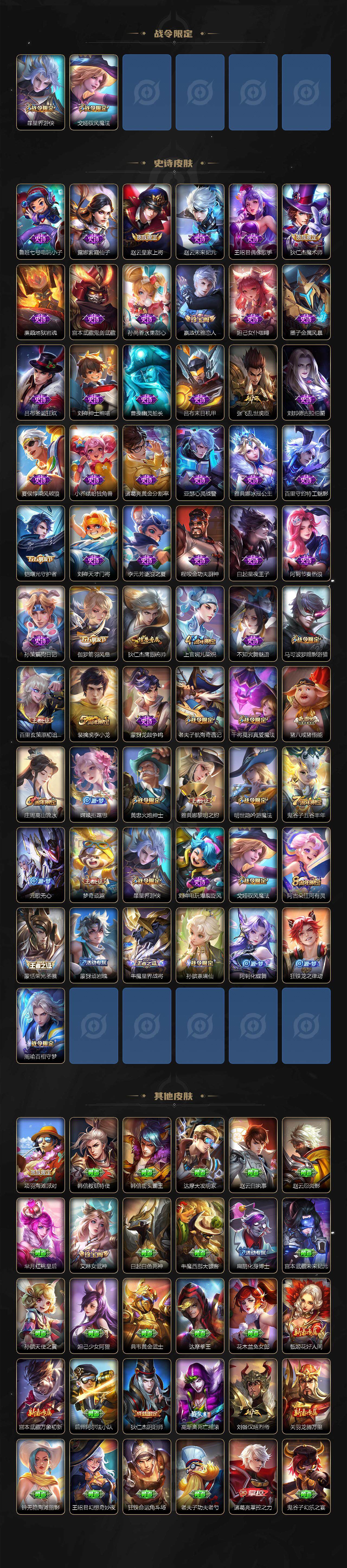 【史诗皮肤】:鲁班七号电玩小子,露娜紫霞仙子,赵云皇家上将,赵云未来纪元,王昭君偶像歌手,狄仁杰魔术师,廉颇地狱岩魂,宫本武藏鬼剑武藏,孙尚香水果甜心,嬴政优雅恋人,妲己女仆咖啡,墨子金属风暴,吕布圣诞狂欢,刘禅绅士熊喵,曹操幽灵船长,吕布末日机甲,张飞乱世虎臣,刘邦德古拉伯爵,夏侯惇乘风破浪,小乔缤纷独角兽,诸葛亮黄金分割率,亚瑟心灵战警,雅典娜冰冠公主,百里守约特工魅影,铠曙光守护者,刘禅天才门将,李元芳逐浪之夏,程咬金