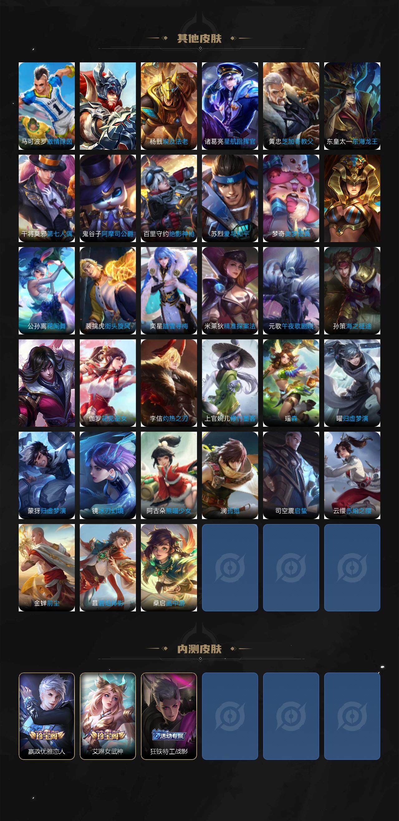 【限定皮肤】:蒙犽顽岩魄,姜子牙天穹之誓,狄仁杰阴阳师,赵云皇家上将,墨子神迹守卫,嬴政优雅恋人,庄周高山流水,高渐离死亡摇滚,白起夜都怪侠,芈月幻夜卜梦,元歌无心,马可波罗暗影游猎,狄仁杰魔术师,狄仁杰万华元夜,达摩沙漠行僧,项羽海滩派对,老夫子醍醐杖,老夫子航海奇遇记,程咬金演武夺筹,兰陵王金庭之子,后羿圣弓游侠,李元芳云中旅人,钟馗神迹守卫,钟馗驱傩正仪,干将莫邪真爱魔法,雅典娜黎明之约,太乙真人华丽摇滚,鬼谷子原初探秘者,鬼谷子五谷丰年,黄忠火炮绅士,苏烈千军破阵,百里玄策原初追逐者,梦奇顽趣,沈梦溪大漠名商,明世隐吟游魔法,裴擒虎李小龙,裴擒虎擒涛扼浪,猪八戒猪悟能,上官婉儿梁祝,嫦娥拒霜思,嫦娥暖冬兔眠,西施玲珑珍味,鲁班大师探海日志,桑启海盐诗旅,暃星界游侠,戈娅驭风魔法,艾琳女武神,阿古朵江河有灵,张良古海寻踪,蒙恬荣光圣徽,刘邦剑破天穹,周瑜熔金海岸