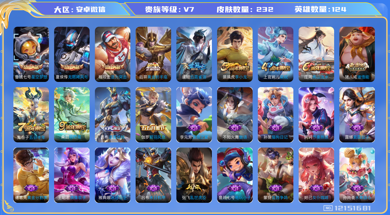 [12151681]AK583 :安卓WX-V7-最强王者段位-125英雄-232皮肤-3典藏-0珍品无双-0无双-0珍品传说-3传说-61史诗