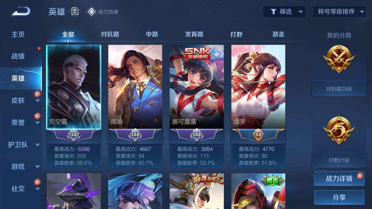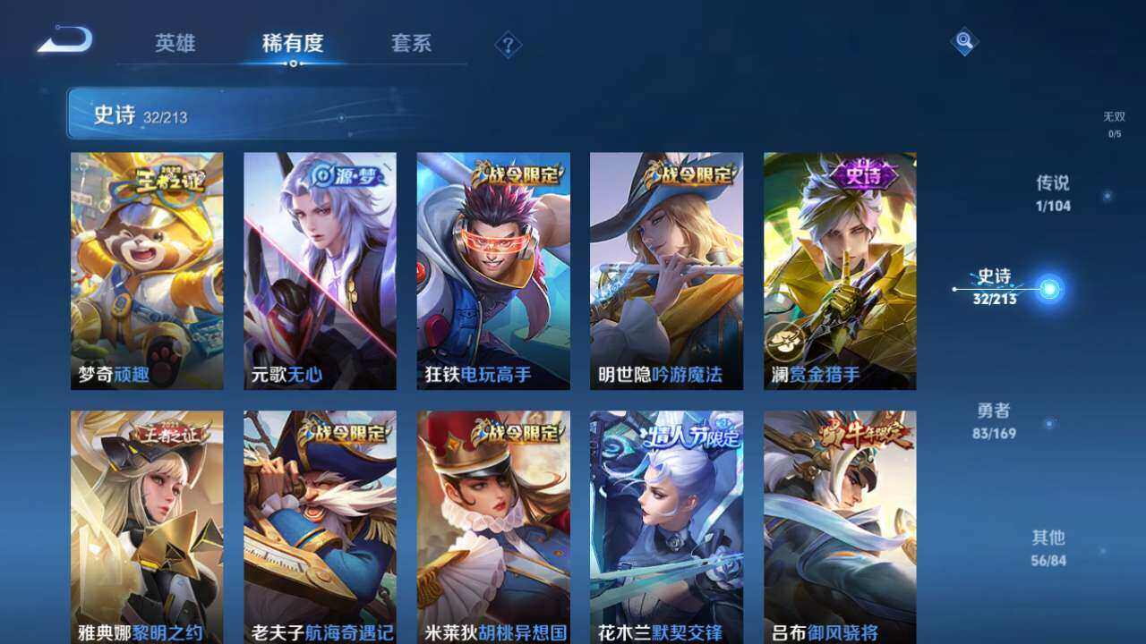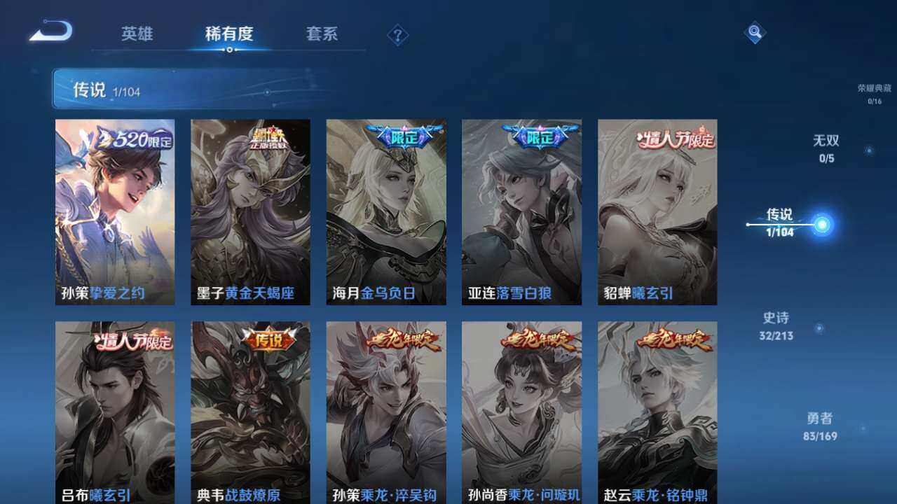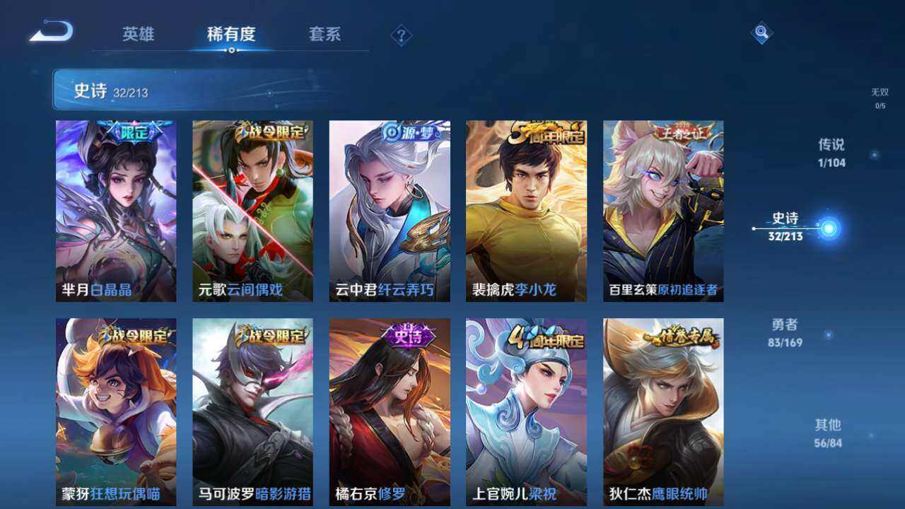 - PX_2103161-Q/至尊星耀/203皮肤/124英雄/4典藏/0珍品无双/1无双/0珍品传说/25传说/62史诗/8稀有英雄 【4 典藏皮肤】全息碎影 孙悟空,银白咏叹调 铠,弑枪猎影 韩信,星域神启 诸葛亮, 【1 无双皮肤】器灵·螭龙剑 曜, 【25 传说皮肤】鹤归松栖 云缨,启明星使 虞姬,碎云 百里守约,逐花归海 澜,无双飞将 马超,李逍遥 曜,云鹰飞将 曜,齐天大圣 孙悟空,永曜