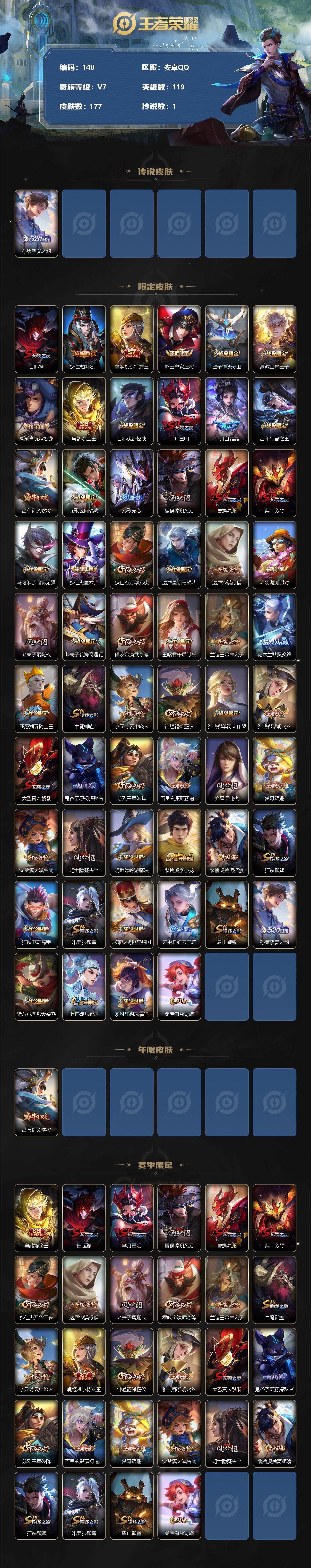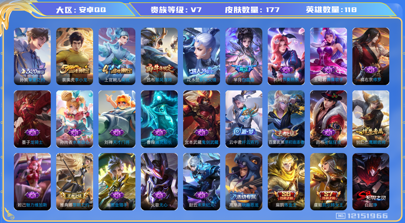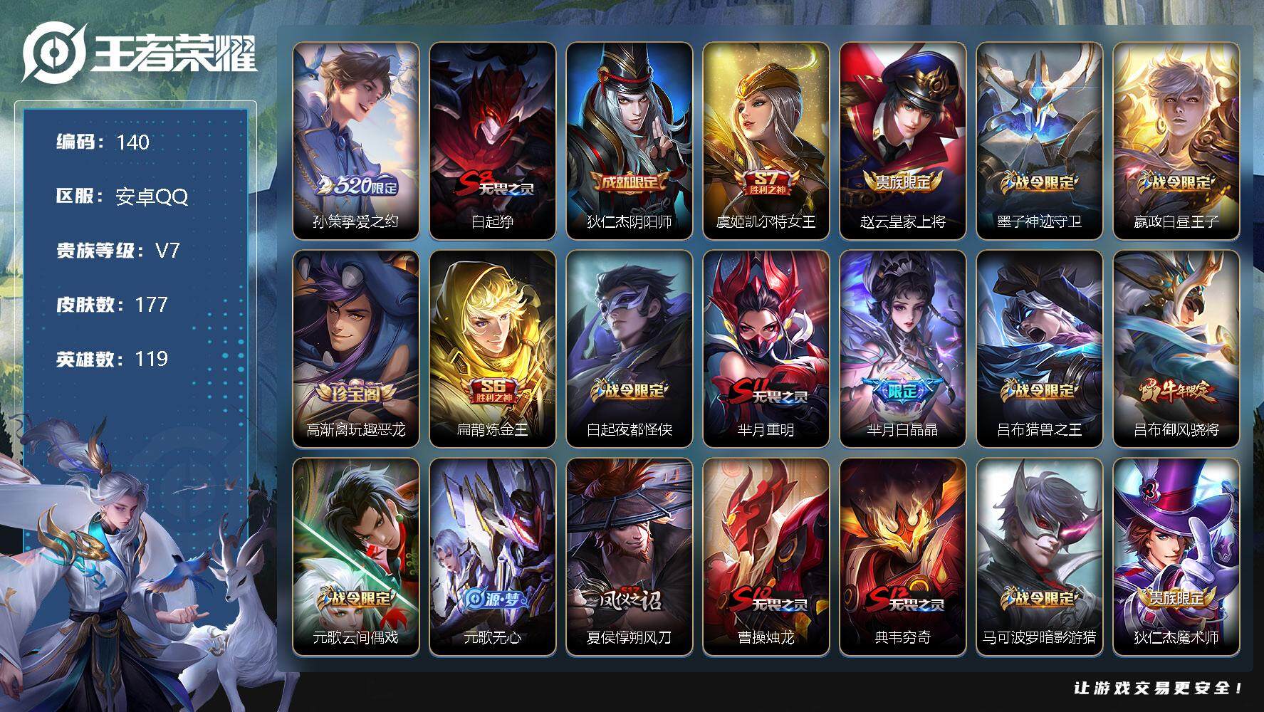 - [12032394]V7 1典藏 5传说 123英雄 235皮肤 可修改实名 优质装备:杀手不太冷,云霓雀翎,淬星耀世,碎云 传说皮:幻光神枪 珍宝阁皮:妄想食味 限定皮:逐霄战戟,鸣野蒿,高山流水,朱雀志(守约年限),孙行者 史诗皮:鸭鸭历险记-刘禅,化蝶舞,龙之律动,雪豹·霜爪,怒海争锋,破空之剑,蒙犽顽岩魄,埋骨钱,决胜骁骑,蔬乡物语(鲁班七号),百相守梦-百里守约,特工魅影,千年之狐,江河有灵,真我赫兹(百里守约),百解令(蒙犽),高渐离燃音魔法,冰冠公主,偶像歌手,电玩·爆裂旋风,猫狗日记-孙策,时之恋人-孙尚香,乱世虎臣,节奏热浪,女仆咖啡,水果甜心,绅士熊喵,天才门将,星夜王子,心灵骇客,功夫厨神,德古拉伯爵,暗隐猎兽者,鬼剑武藏,心灵战警,舞动绿茵,纤云弄巧,拒霜思,缤纷独角兽,乘风破浪,月团寄思,箭羽风息,圣诞恋歌,鹰眼统帅,魅力维加斯,奇遇舞章,未来纪元-赵云