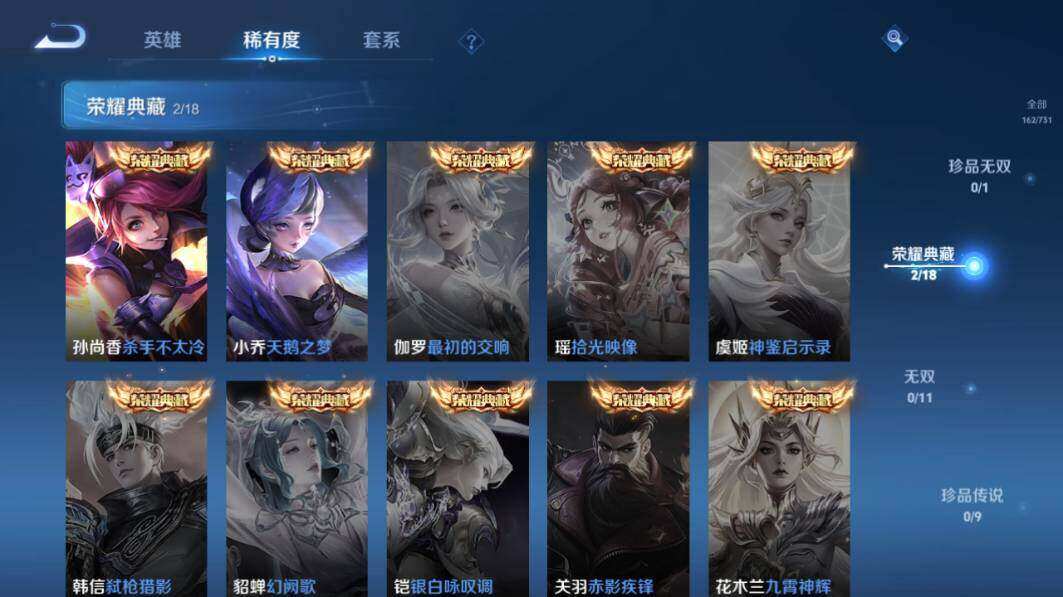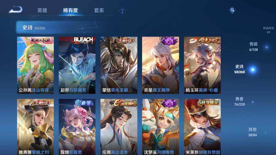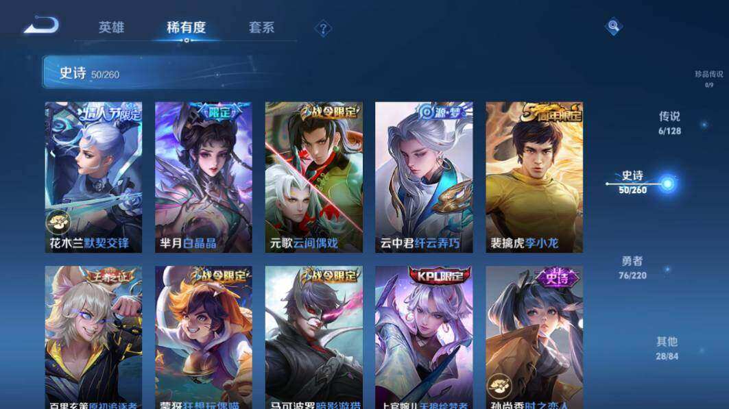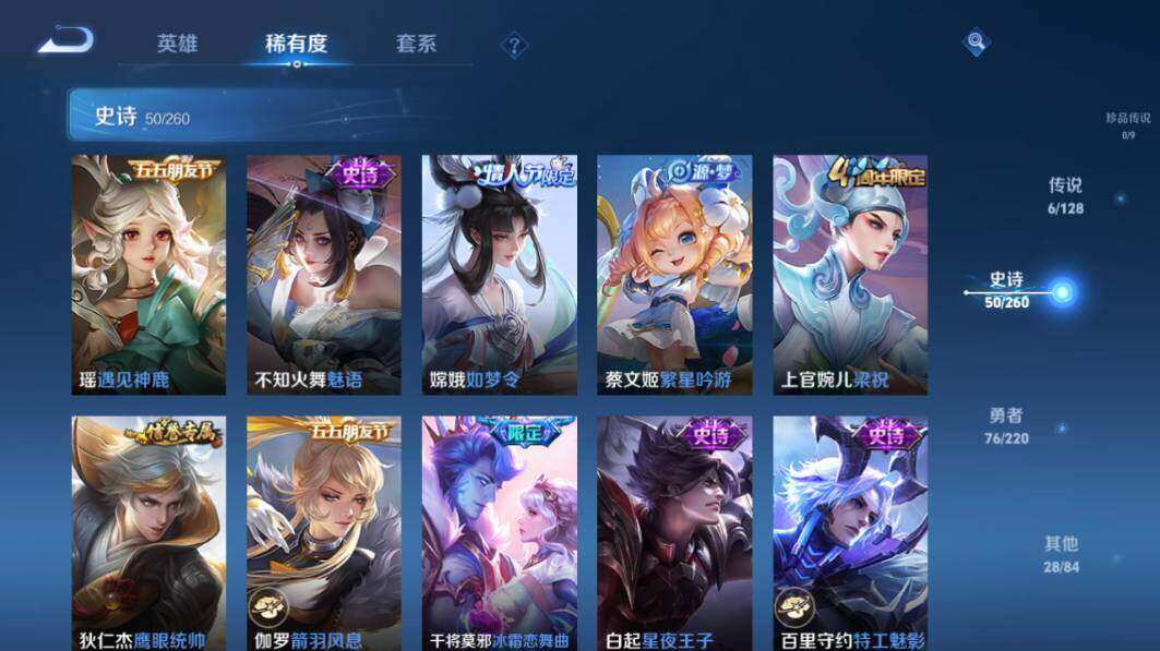 【史诗皮肤】:鲁班七号电玩小子,露娜紫霞仙子,赵云皇家上将,貂蝉圣诞恋歌,甄姬冰雪圆舞曲,王昭君偶像歌手,狄仁杰魔术师,廉颇地狱岩魂,宫本武藏鬼剑武藏,孙尚香水果甜心,妲己女仆咖啡,墨子金属风暴,刘禅绅士熊喵,张飞乱世虎臣,王昭君凤凰于飞,花木兰水晶猎龙者,刘邦德古拉伯爵,小乔缤纷独角兽,兰陵王暗隐猎兽者,安琪拉心灵骇客,百里守约特工魅影,白起星夜王子,干将莫邪冰霜恋舞曲,伽罗箭羽风息,