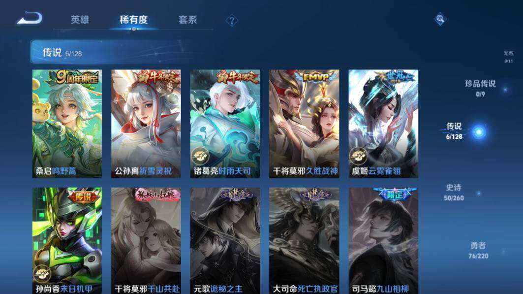【传说皮肤】:桑启鸣野蒿,公孙离祈雪灵祝,诸葛亮时雨天司,干将莫邪久胜战神,虞姬云霓雀翎,孙尚香末日机甲