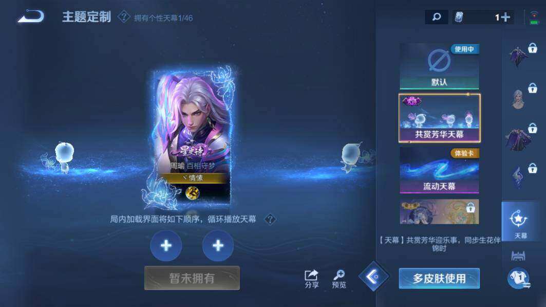 裴擒虎李小龙,上官婉儿梁祝,公孙离祈雪灵祝,诸葛亮时雨天司,上官婉儿天狼绘梦者,王昭君凤凰于飞,花木兰默契交锋,嫦娥如梦令,干将莫邪冰霜恋舞曲,芈月白晶晶,杨玉环寅虎·心曲,桑启鸣野蒿
