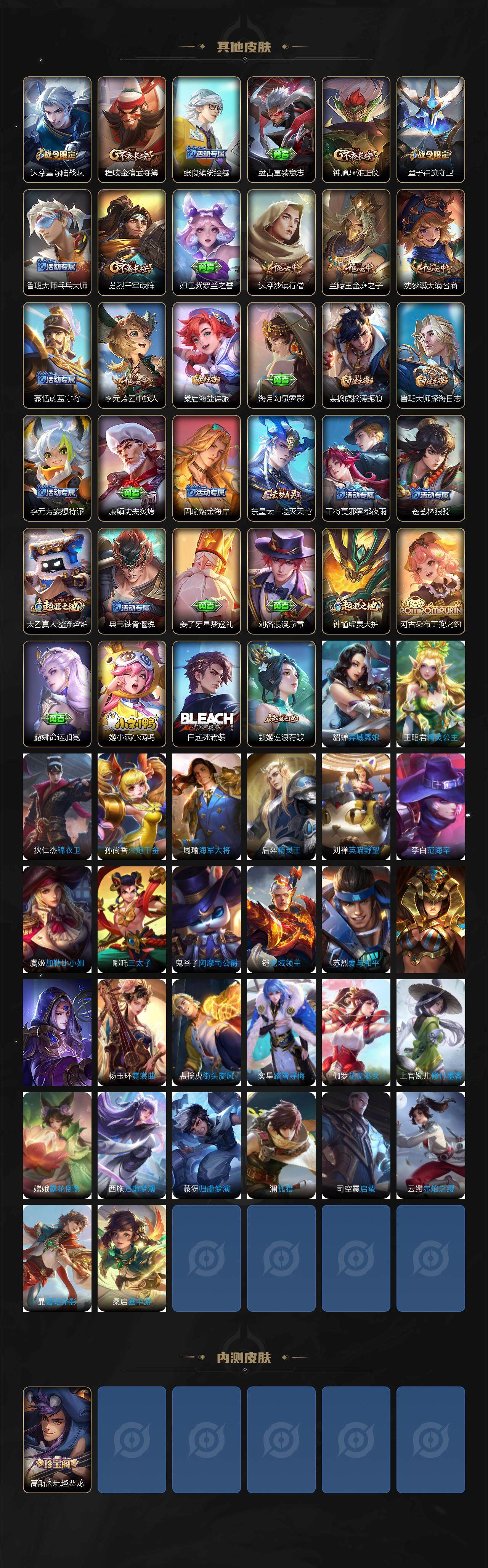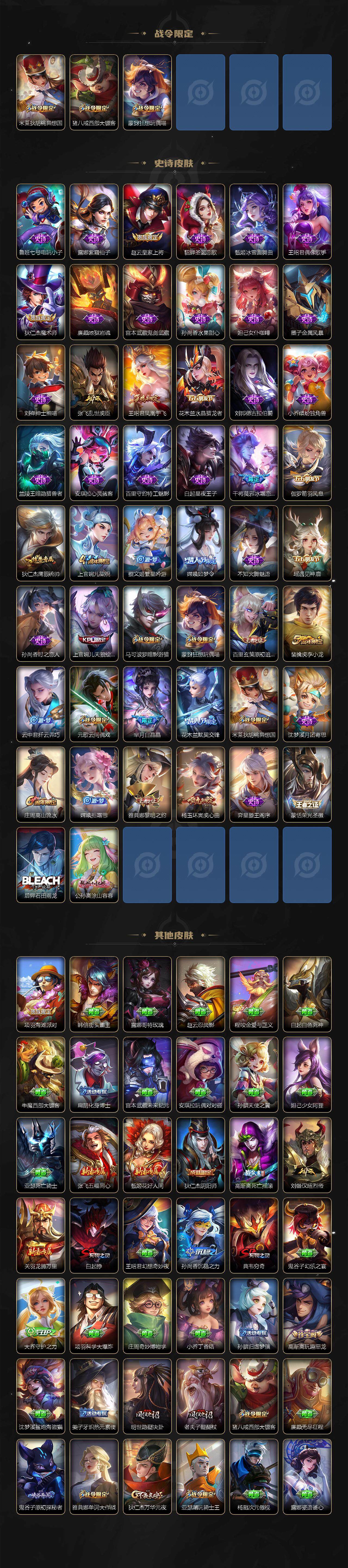 【限定皮肤】:白起狰,狄仁杰阴阳师,赵云皇家上将,墨子神迹守卫,庄周高山流水,高渐离死亡摇滚,高渐离玩趣恶龙,芈月白晶晶,元歌云间偶戏,典韦穷奇,马可波罗暗影游猎,狄仁杰魔术师,狄仁杰万华元夜,达摩星际陆战队,达摩沙漠行僧,项羽海滩派对,老夫子醍醐杖,程咬金演武夺筹,王昭君凤凰于飞,兰陵王金庭之子,花木兰默契交锋,亚瑟潮玩骑士王,李元芳云中旅人,钟馗驱傩正仪,杨玉环寅虎心曲,干将莫邪冰霜恋舞曲,雅典娜单词大作战,雅典娜黎明之约,蔡文姬繁星吟游,鬼谷子原初探秘者,诸葛亮时雨天司,苏烈千军破阵,百里玄策原初追逐者,公孙离祈雪灵祝,沈梦溪大漠名商,明世隐疑决卦,裴擒虎李小龙,裴擒虎擒涛扼浪,米莱狄胡桃异想国,云中君纤云弄巧,猪八戒西部大镖客,上官婉儿梁祝,上官婉儿天狼绘梦者,嫦娥如梦令,嫦娥拒霜思,蒙犽狂想玩偶喵,鲁班大师探海日志,桑启海盐诗旅,蒙恬荣光圣徽,周瑜熔金海岸