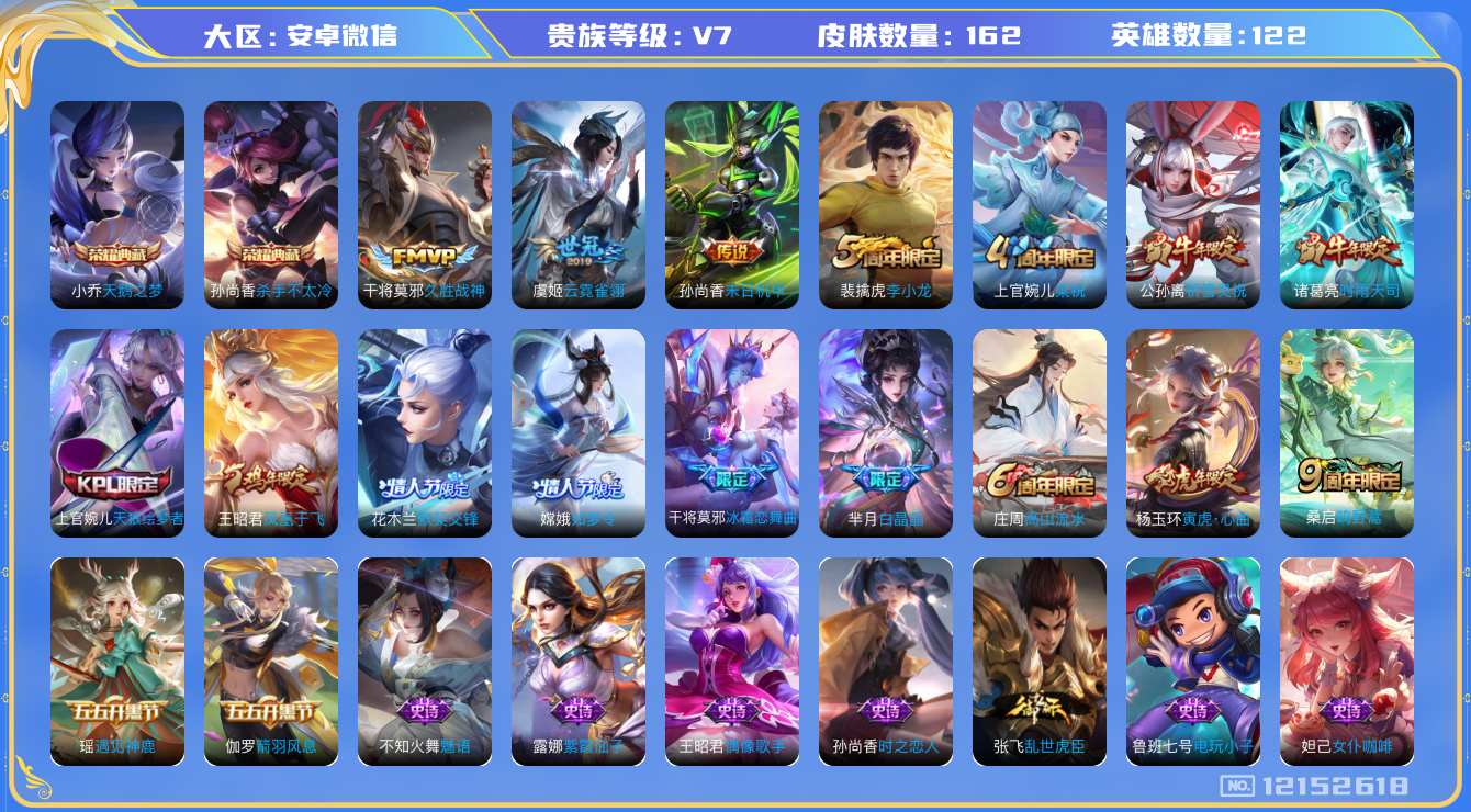 - PX_2110797-实名: 可修改 贵族等级: V6 英雄数: 123 皮肤数: 113 传说皮: 地狱火,幻光神枪 限定皮: 美猴王,孙行者,诗剑行,怒海麟威,齐天大圣