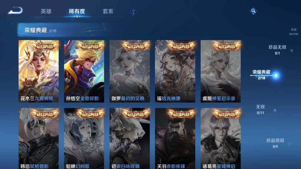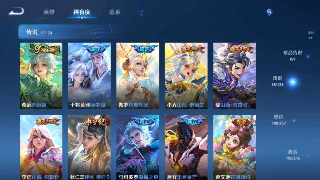 【传说皮肤】:桑启鸣野蒿,干将莫邪画中仙,伽罗炽翼辉光,小乔山海琳琅生,曜山海苍雷引,李信山海炽霜斩,狄仁杰神器狴犴令,马可波罗深海之息,后羿无尽星芒,蔡文姬花朝如约,孙策末日机甲,瑶时之祈愿,鲁班七号寅虎瑞焰,公孙离祈雪灵祝,虞姬启明星使,孙悟空零号赤焰,李白凤求凰,狄仁杰超时空战士