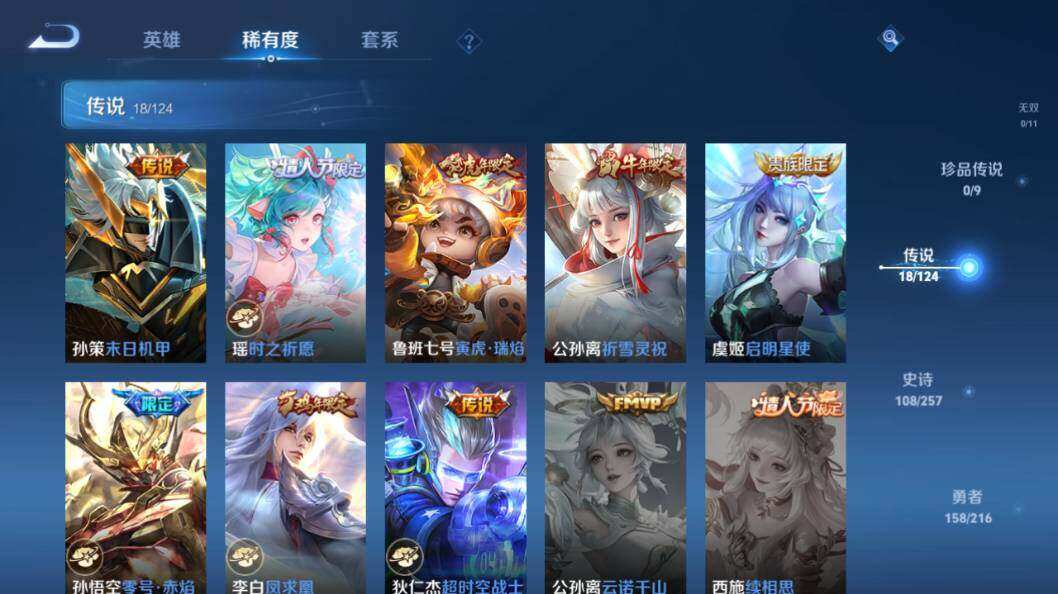 - PX_2097104-96 安卓QQ/至尊星耀/108皮肤/85英雄/0典藏/0珍品无双/0无双/0珍品传说/18传说/25史诗/4稀有英雄 【18 传说皮肤】启明星使 虞姬,碎云 百里守约,逐花归海 澜,电玩·雷克斯 澜,零号·赤焰 孙悟空,地狱火 孙悟空,云鹰飞将 曜,游龙清影 西施,诗剑行 李白,仲夏夜之梦 貂蝉,记忆之芯 公孙离,炽阳神光 镜,霜月吟 露娜,末日机甲 孙尚香,一念神魔 李信