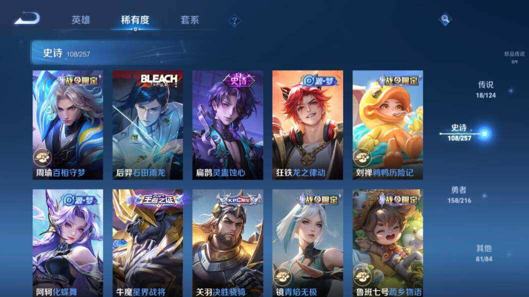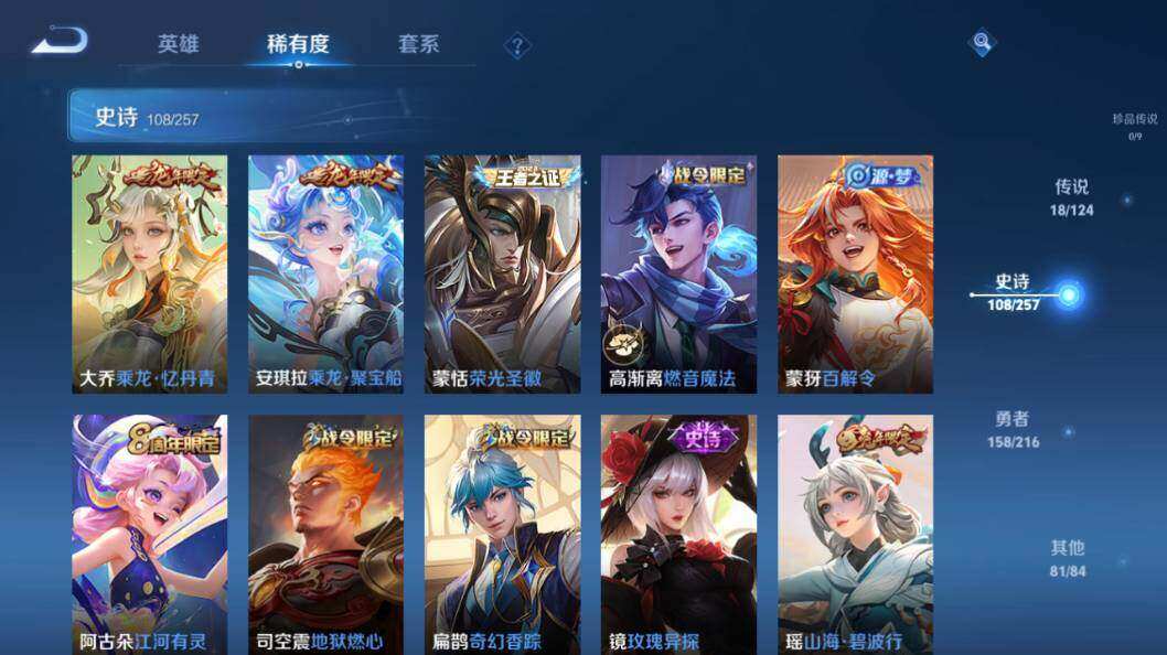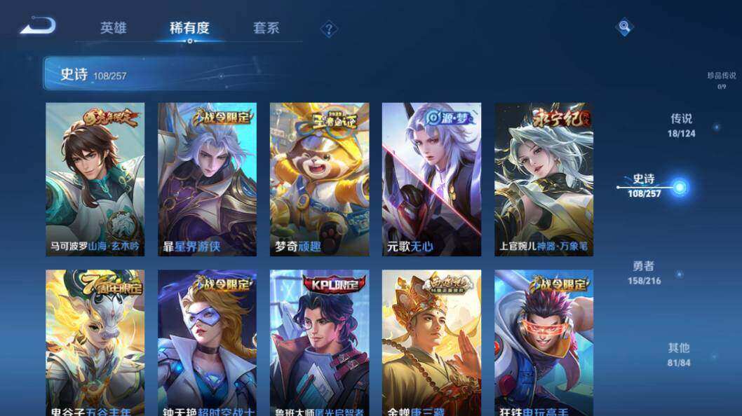 明世隐疑决卦,鬼谷子原初探秘者,狄仁杰万华元夜,程咬金演武夺筹,钟馗驱傩正仪,苏烈千军破阵,吕布猎兽之王,典韦蓝屏警告,刘邦夺宝奇兵,蒙犽狂想玩偶喵,元歌云间偶戏,弈星混沌棋,达摩沙漠行僧,兰陵王金庭之子,沈梦溪大漠名商,李元芳云中旅人,桑启海盐诗旅,裴擒虎擒涛扼浪,鲁班大师探海日志,张良古海寻踪,项羽苍威无极,镜青焰无极
