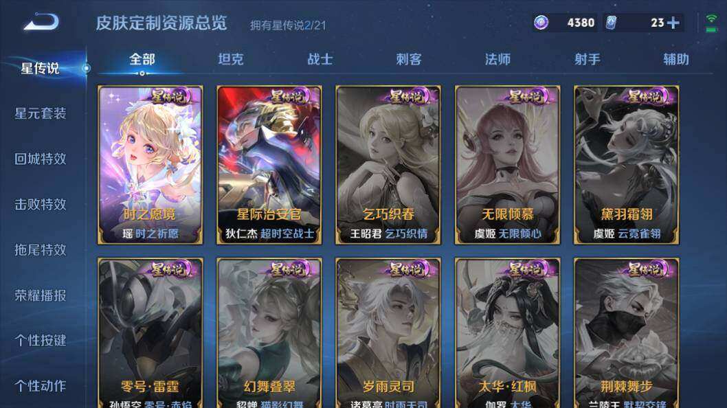 伽罗箭羽风息,李元芳逐浪之夏,不知火舞魅语,大乔猫狗日记,阿轲节奏热浪,王昭君偶像歌手,孙尚香时之恋人,阿轲暗夜猫娘,雅典娜冰冠公主,吕布末日机甲,墨子龙骑士,嬴政摇滚巨星,刘禅绅士熊喵,刘禅天才门将,白起星夜王子,安琪拉心灵骇客,程咬金功夫厨神,刘邦德古拉伯爵,兰陵王暗隐猎兽者,曹操幽灵船长,宫本武藏鬼剑武藏,亚瑟心灵战警,钟馗乐园奇幻夜,蔡文姬舞动绿茵,廉颇地狱岩魂,小乔缤纷独角兽,夏侯惇乘风破浪,花木兰水晶猎龙者,铠曙光守护者,墨子金属风暴,百里玄策原初追逐者,吕布圣诞狂欢,貂蝉圣诞恋歌,嬴政暗夜贵公子,嫦娥拒霜思,雅典娜黎明之约,镜玫瑰异探,蒙犽百解令,高渐离燃音魔法,大乔乘龙·忆丹青,安琪拉乘龙·聚宝船,关羽决胜骁骑