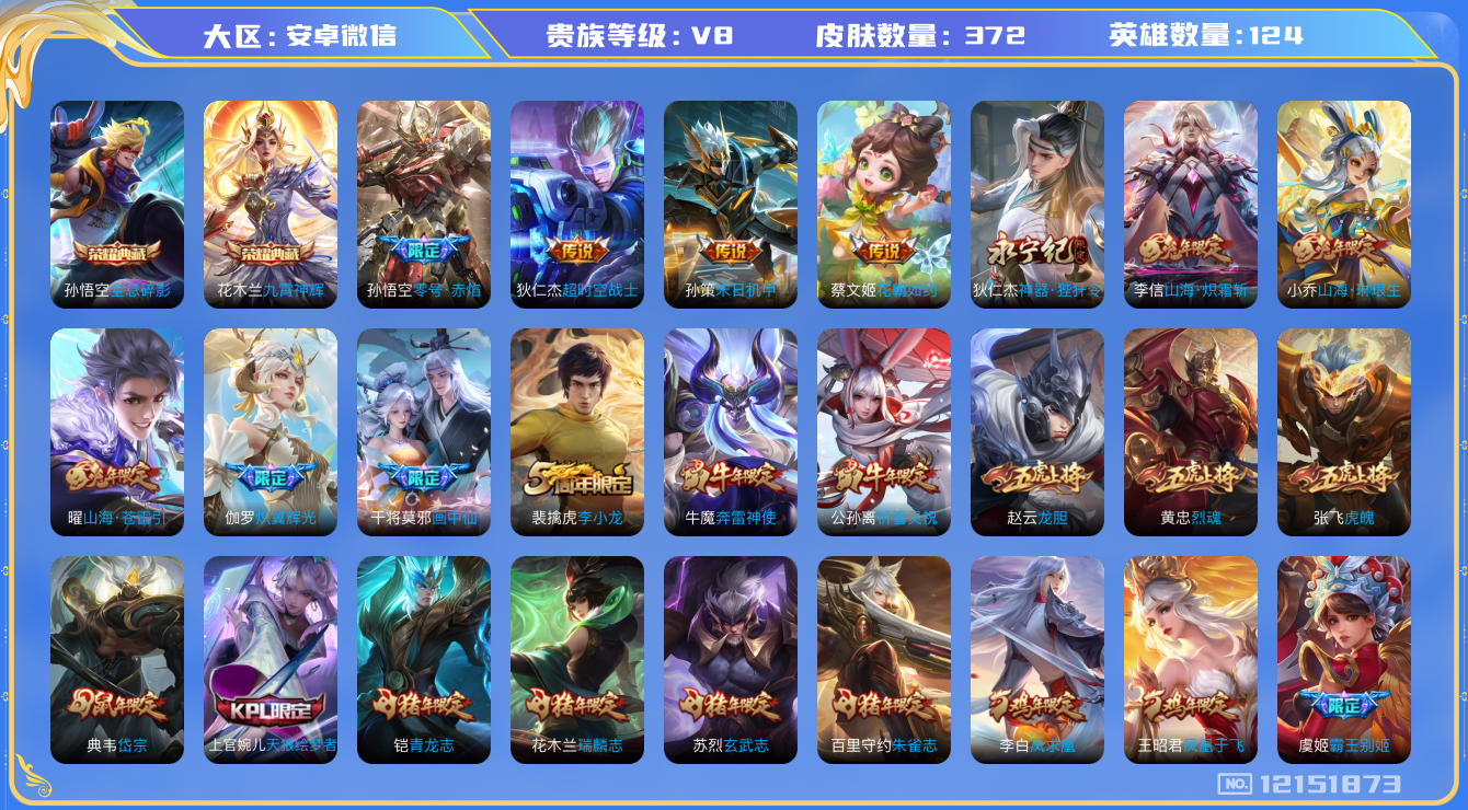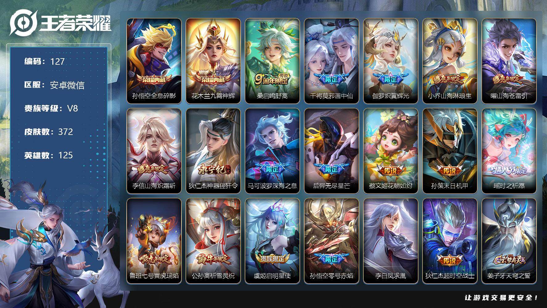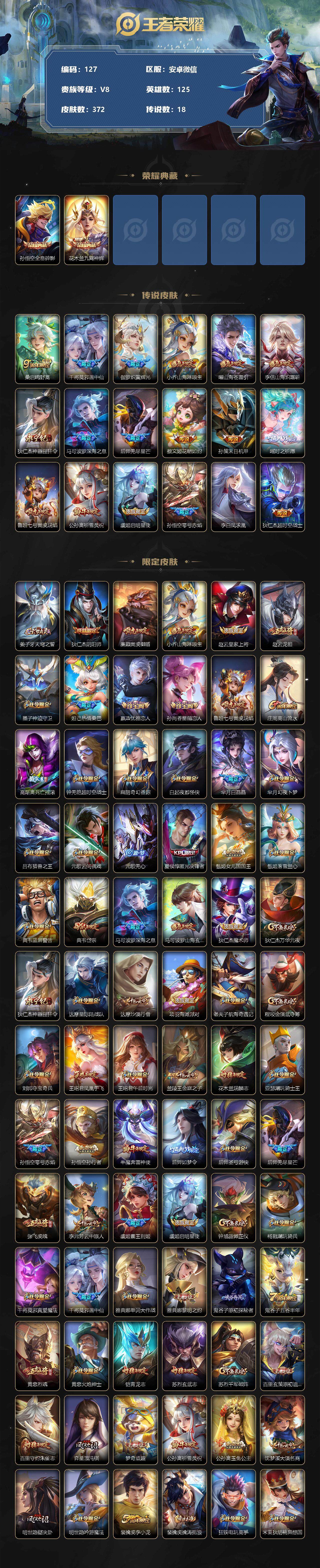 [12151873]AK608 安卓WX-V8-最强王者段位-125英雄-372皮肤-2典藏-0珍品无双-0无双-0珍品传说-18传说-108史诗