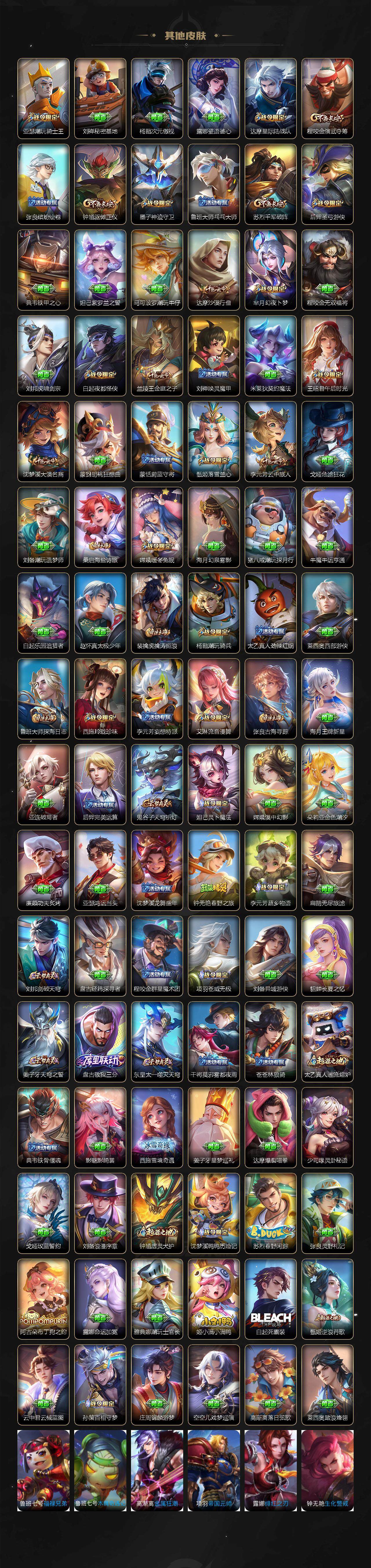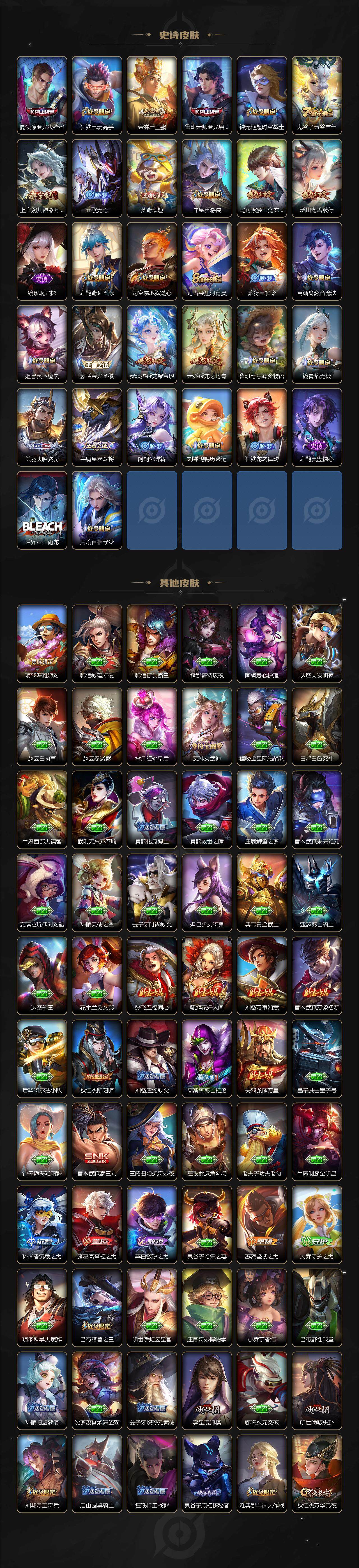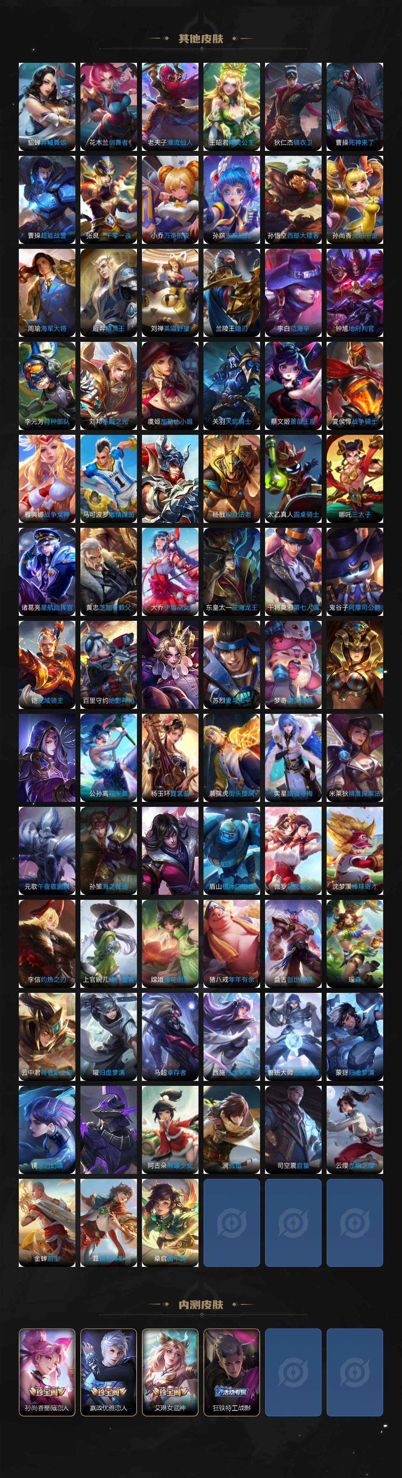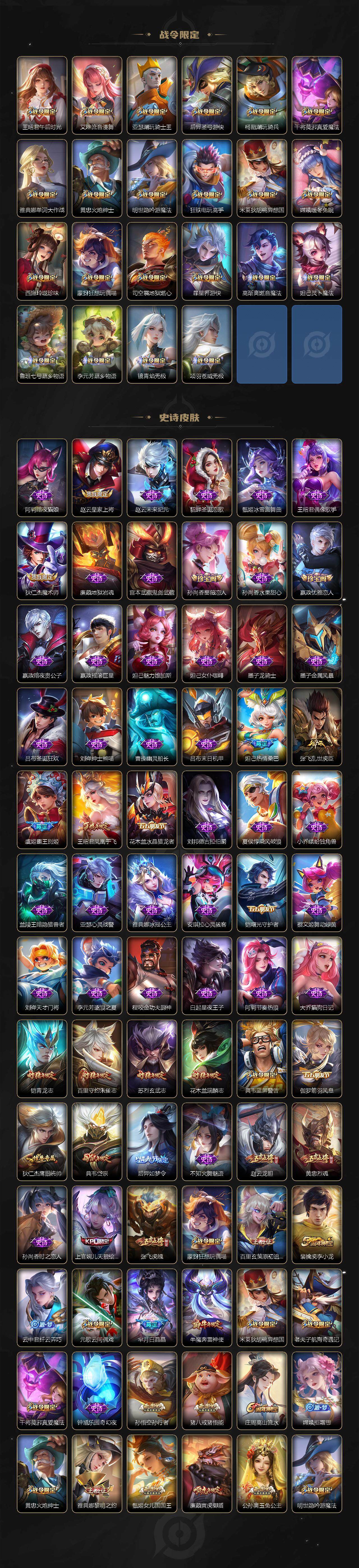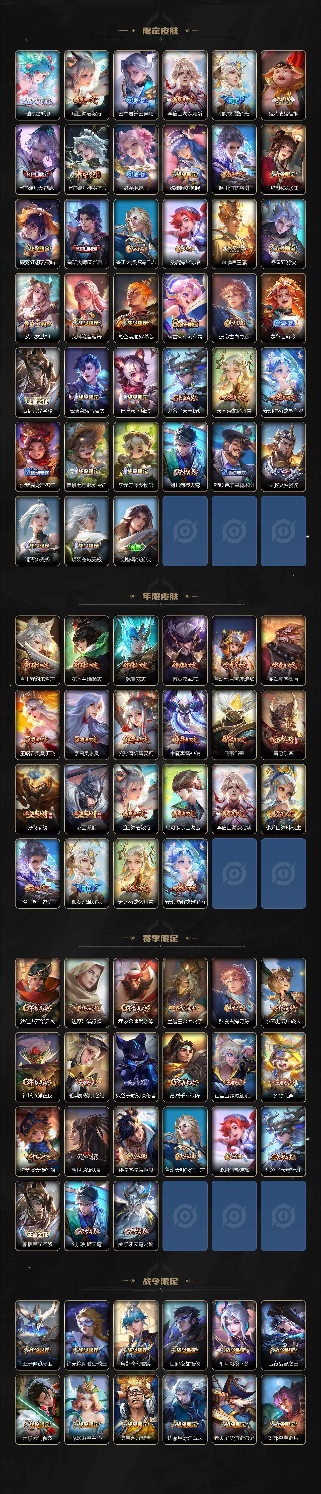 【限定皮肤】:姜子牙天穹之誓,狄仁杰阴阳师,廉颇寅虎御盾,小乔山海琳琅生,赵云皇家上将,赵云龙胆,墨子神迹守卫,妲己热情桑巴,嬴政优雅恋人,孙尚香蔷薇恋人,鲁班七号寅虎瑞焰,庄周高山流水,高渐离死亡摇滚,钟无艳超时空战士,扁鹊奇幻香踪,白起夜都怪侠,芈月白晶晶,芈月幻夜卜梦,吕布猎兽之王,元歌云间偶戏,元歌无心,夏侯惇匿光决锋者,甄姬女儿国国王,甄姬落雪兰心,典韦蓝屏警告,典韦岱宗,马可波罗深海之息,马可波罗山海玄木吟,狄仁杰魔术师,狄仁杰万华元夜,狄仁杰神器狴犴令,达摩星际陆战队,达摩沙漠行僧,项羽海滩派对,老夫子航海奇遇记,程咬金演武夺筹,刘邦夺宝奇兵,王昭君凤凰于飞,王昭君午后时光,兰陵王金庭之子,花木兰瑞麟志,亚瑟潮玩骑士王,孙悟空零号赤焰,孙悟空孙行者,牛魔奔雷神使,后羿如梦令,后羿圣弓游侠,后羿无尽星芒,张飞虎魄,李元芳云中旅人,虞姬霸王别姬,虞姬启明星使,钟馗驱傩正仪,杨戬潮玩骑兵,干将莫邪真爱魔法,干将莫邪画中仙,雅典娜单词大作战,雅典娜黎明之约,鬼谷子原初探秘者,鬼谷子五谷丰年,黄忠烈魂,黄忠火炮绅士,铠青龙志,苏烈玄武志,苏烈千军破阵,百里玄策原初追逐者,百里守约朱雀志,弈星混沌棋,梦奇顽趣,公孙离祈雪灵祝,公孙离玉兔公主,沈梦溪大漠名商,明世隐疑决卦,明世隐吟游魔法,裴擒虎李小龙,裴擒虎擒涛扼浪,狂铁电玩高手,米莱狄胡桃异想国,瑶时之祈愿,瑶山海碧波行,云中君纤云弄巧,李信山海炽霜斩,伽罗炽翼辉光,猪八戒猪悟能,上官婉儿天狼绘梦者,上官婉儿神器万象笔,嫦娥拒霜思,嫦娥暖冬兔眠,曜山海苍雷引,西施玲珑珍味,蒙犽狂想玩偶喵,鲁班大师匿光启智者,鲁班大师探海日志,桑启海盐诗旅,金蝉唐三藏,暃星界游侠,艾琳女武神,艾琳流音漫舞,司空震地狱燃心,阿古朵江河有灵,张良古海寻踪,蒙犽百解令,蒙恬荣光圣徽