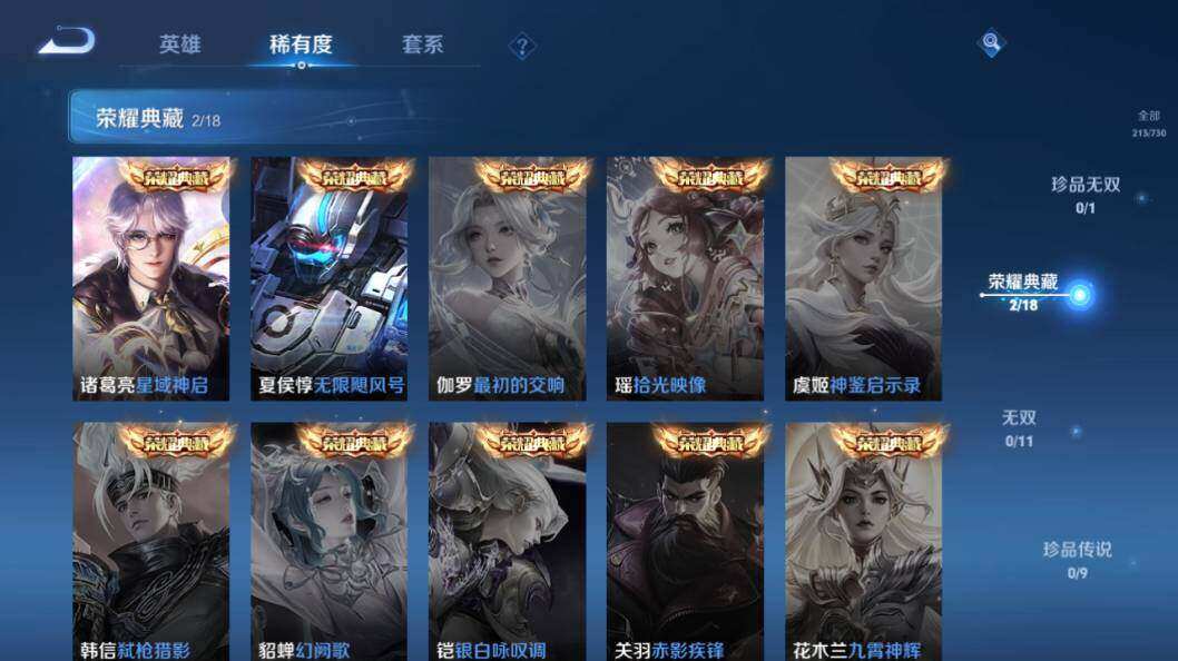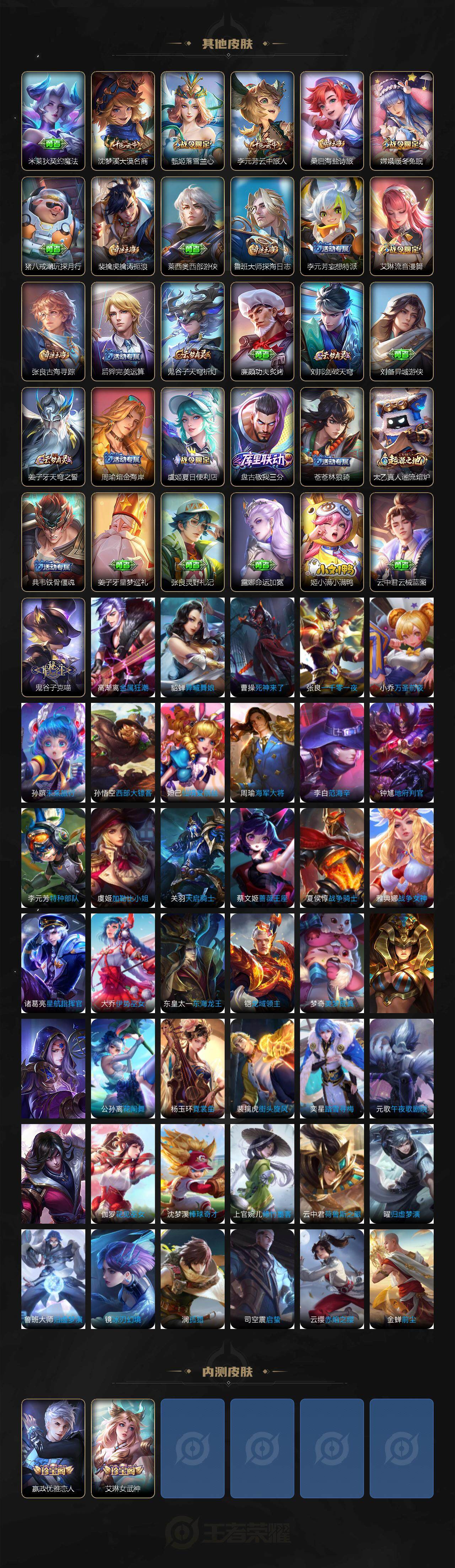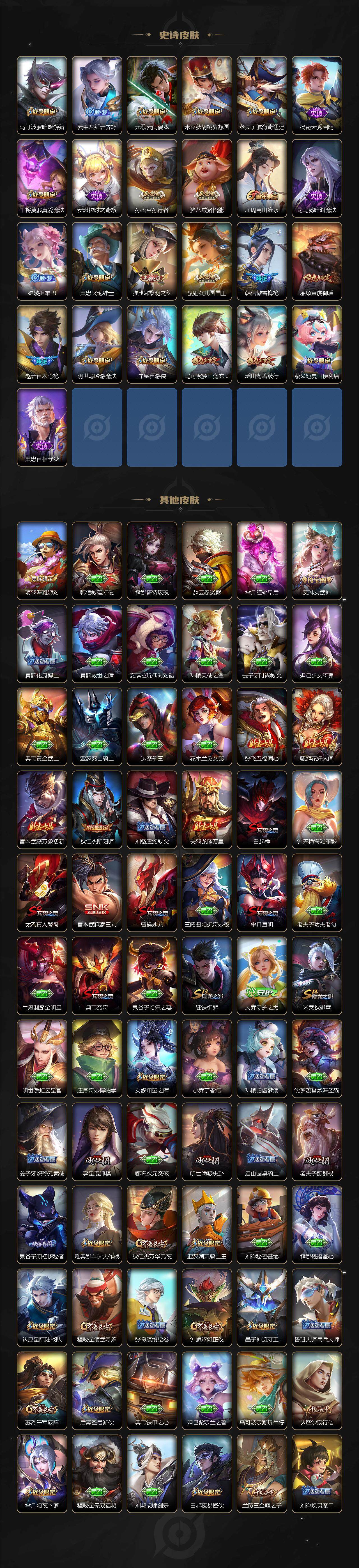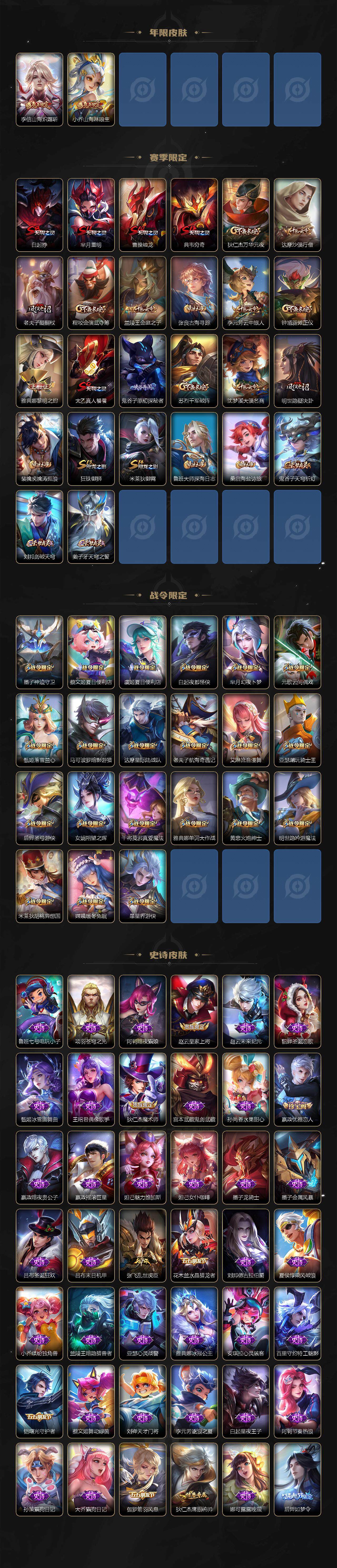 【限定皮肤】:白起狰,蔡文姬夏日便利店,虞姬夏日便利店,姜子牙天穹之誓,狄仁杰阴阳师,廉颇寅虎御盾,小乔山海琳琅生,赵云皇家上将,赵云百木心枪,墨子神迹守卫,嬴政优雅恋人,孙尚香异界灵契,鲁班七号寅虎瑞焰,庄周高山流水,白起夜都怪侠,芈月重明,芈月幻夜卜梦,元歌云间偶戏,甄姬女儿国国王,甄姬落雪兰心,曹操烛龙,典韦穷奇,马可波罗暗影游猎,马可波罗山海玄木吟,狄仁杰魔术师,狄仁杰万华元夜,达摩星际陆战队,达摩沙漠行僧,项羽海滩派对,老夫子醍醐杖,老夫子航海奇遇记,程咬金演武夺筹,韩信傲雪梅枪,兰陵王金庭之子,亚瑟潮玩骑士王,孙悟空孙行者,孙悟空齐天大圣,后羿如梦令,后羿圣弓游侠,李元芳云中旅人,虞姬启明星使,钟馗驱傩正仪,女娲朔望之晖,干将莫邪真爱魔法,雅典娜单词大作战,雅典娜黎明之约,太乙真人饕餮,鬼谷子原初探秘者,诸葛亮时雨天司,黄忠火炮绅士,苏烈千军破阵,弈星混沌棋,沈梦溪大漠名商,明世隐疑决卦,明世隐吟游魔法,裴擒虎寅虎赤拳,裴擒虎擒涛扼浪,狂铁御狮,米莱狄御霄,米莱狄胡桃异想国,瑶山海碧波行,云中君纤云弄巧,李信山海炽霜斩,猪八戒猪悟能,嫦娥拒霜思,嫦娥暖冬兔眠,鲁班大师探海日志,桑启海盐诗旅,暃星界游侠,艾琳女武神,艾琳流音漫舞,张良古海寻踪,鬼谷子天穹祈灯,刘邦剑破天穹,刘备异域游侠,周瑜熔金海岸