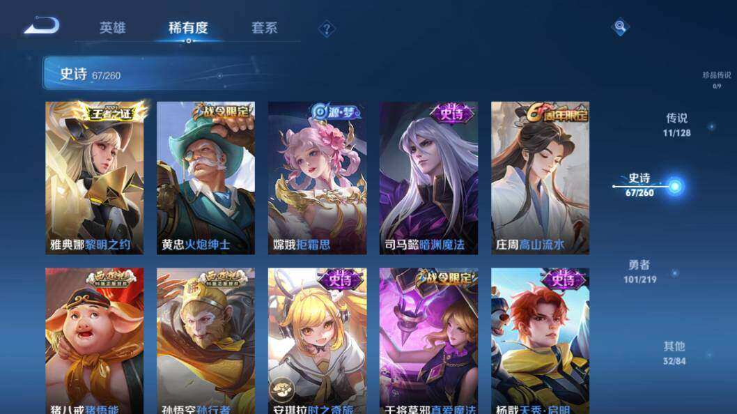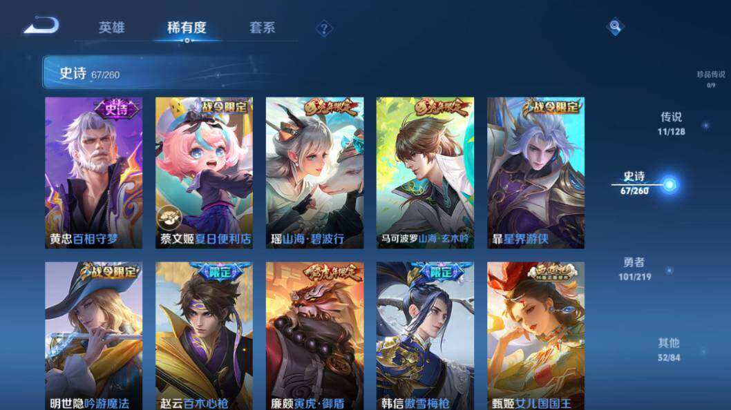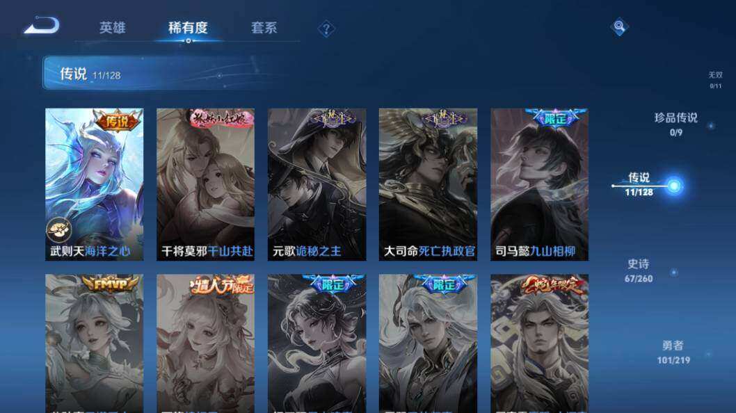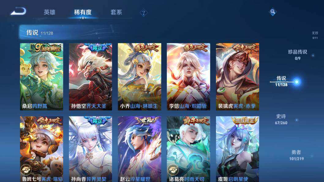 【传说皮肤】:桑启鸣野蒿,孙悟空齐天大圣,小乔山海琳琅生,李信山海炽霜斩,裴擒虎寅虎赤拳,鲁班七号寅虎瑞焰,孙尚香异界灵契,赵云淬星耀世,诸葛亮时雨天司,虞姬启明星使,武则天海洋之心