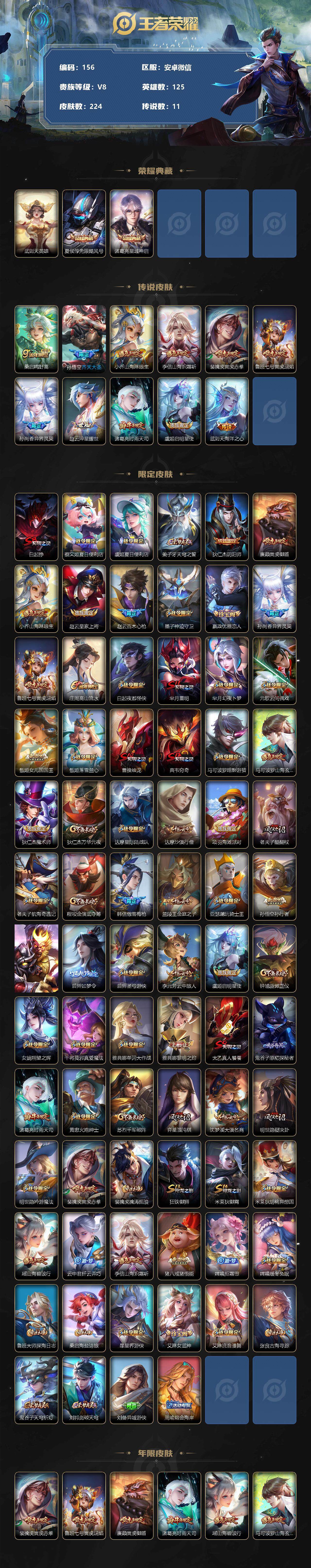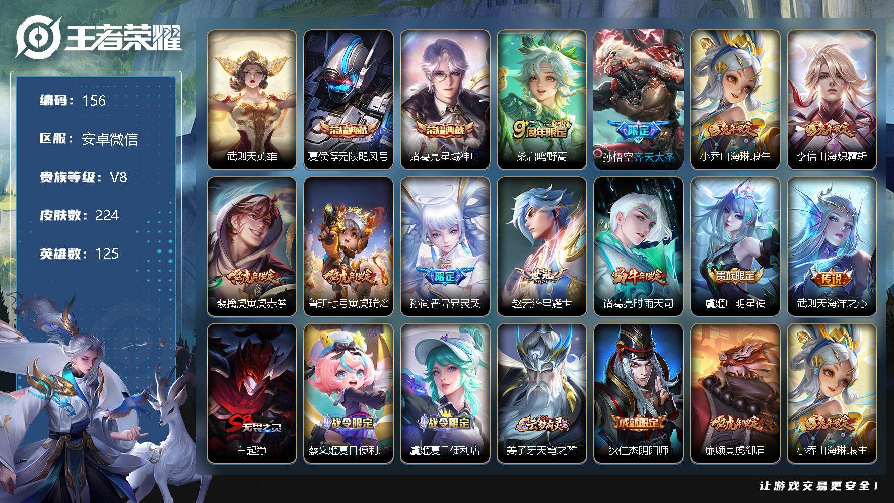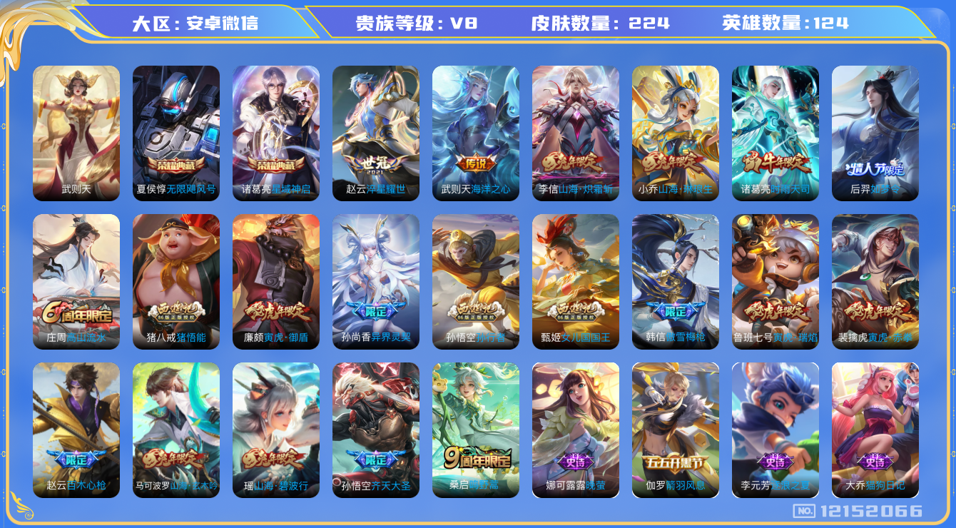 [12152066]AK753【商品标题】:安卓WX-V8-最强王者段位-125英雄-224皮肤-2典藏-0珍品无双-0无双-0珍品传说-11传说-67史诗