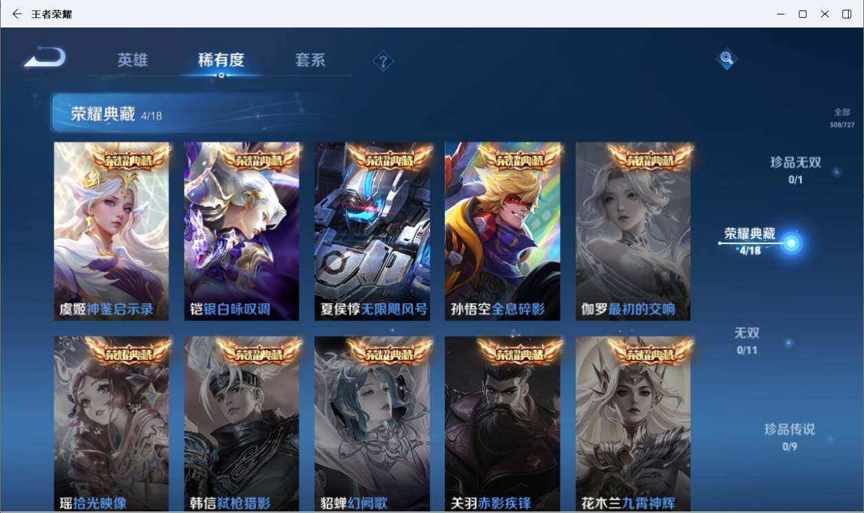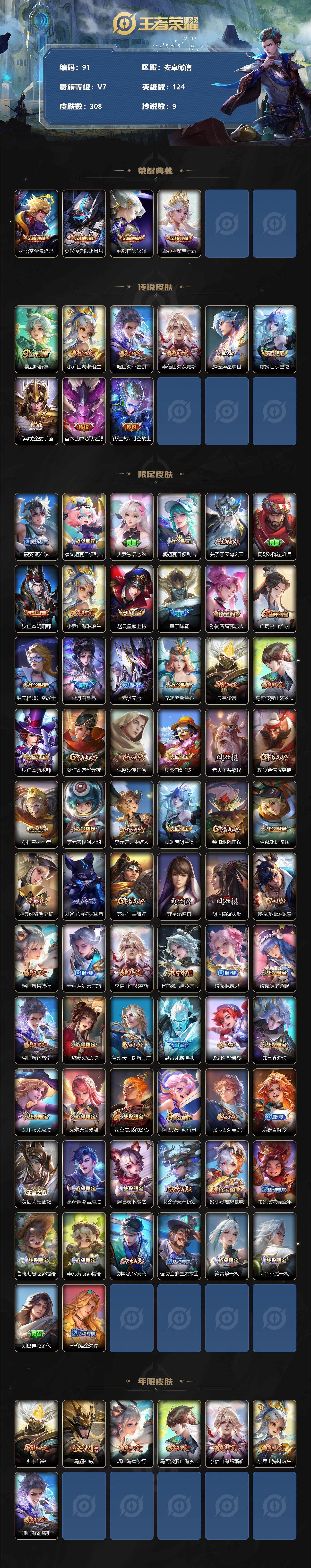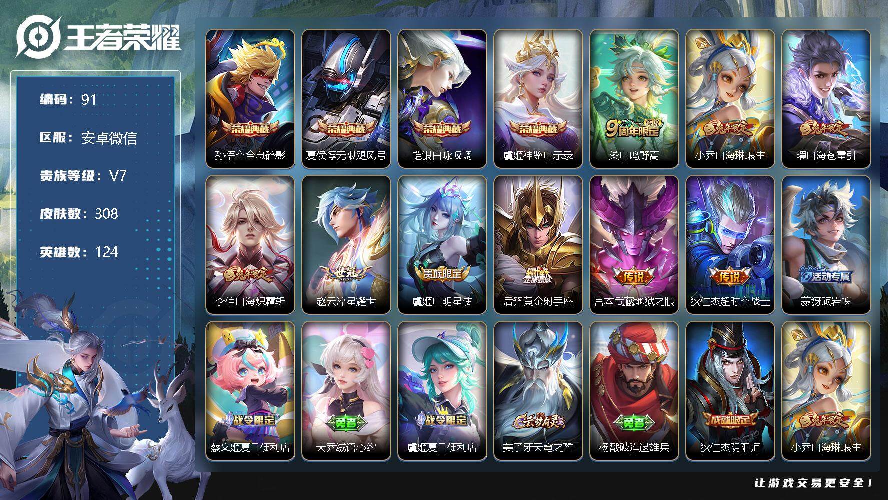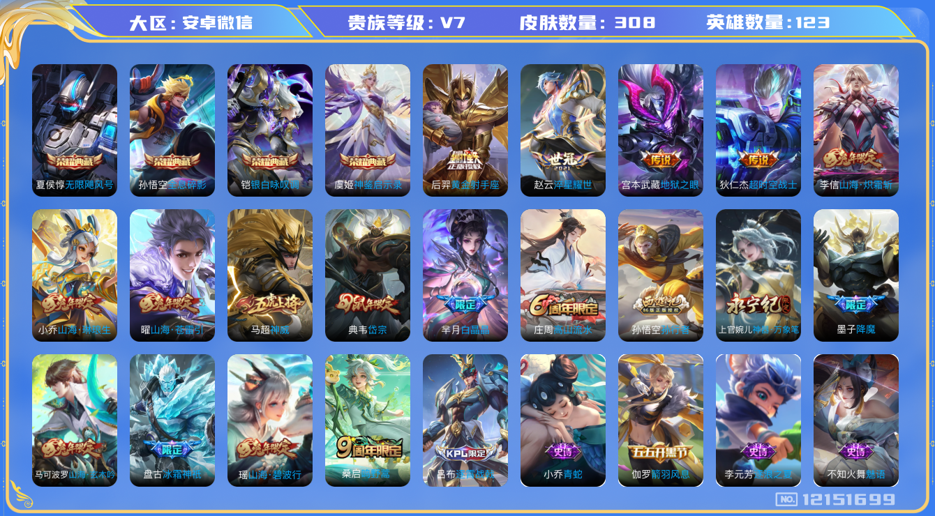 [12151699]【商品标题】:安卓WX-V7-最强王者段位-124英雄-308皮肤-4典藏-0珍品无双-0无双-0珍品传说-9传说-76史诗