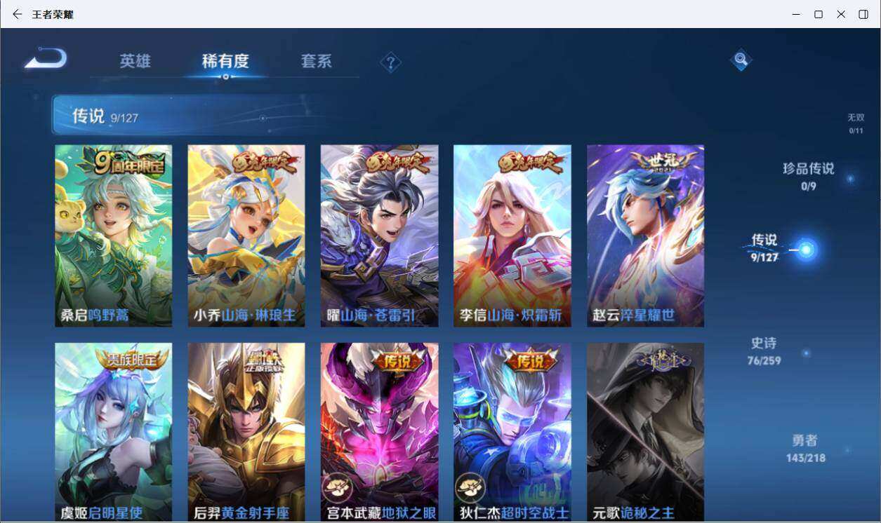 【传说皮肤】:桑启鸣野蒿,小乔山海琳琅生,曜山海苍雷引,李信山海炽霜斩,赵云淬星耀世,虞姬启明星使,后羿黄金射手座,宫本武藏地狱之眼,狄仁杰超时空战士