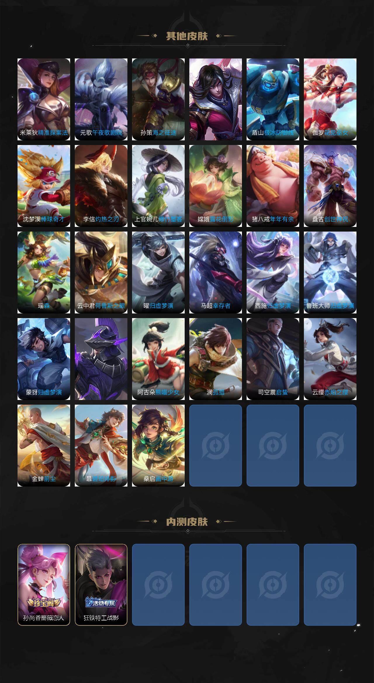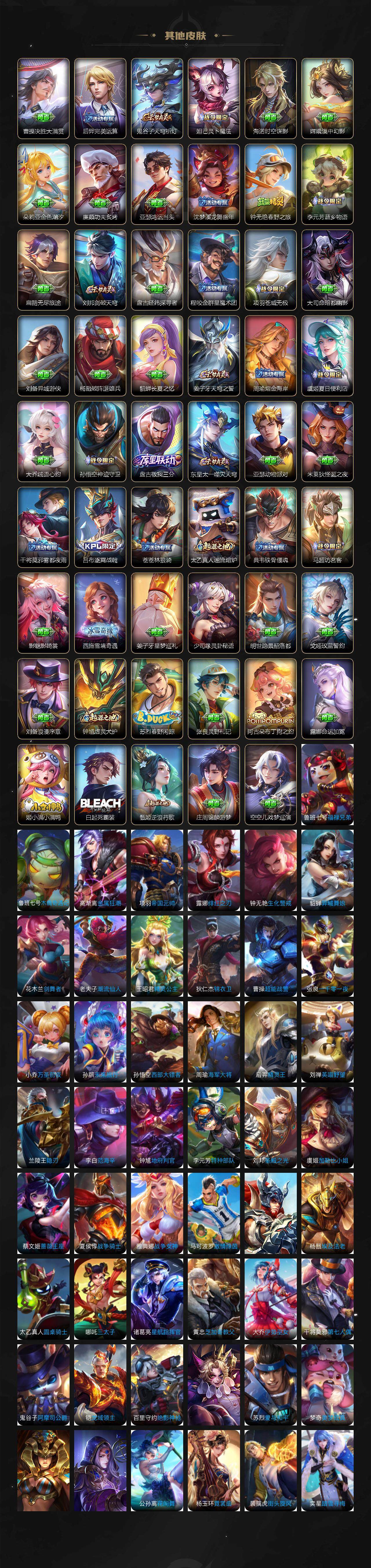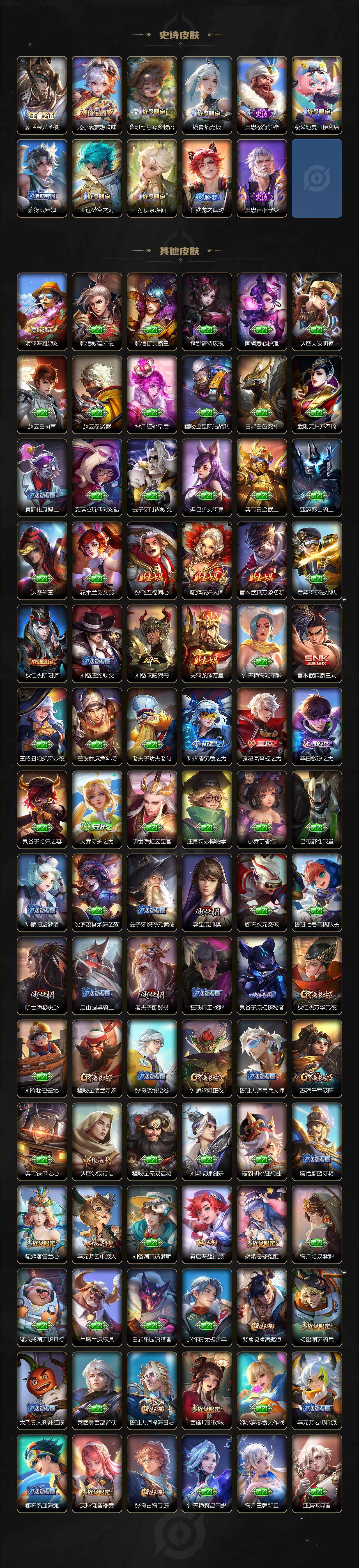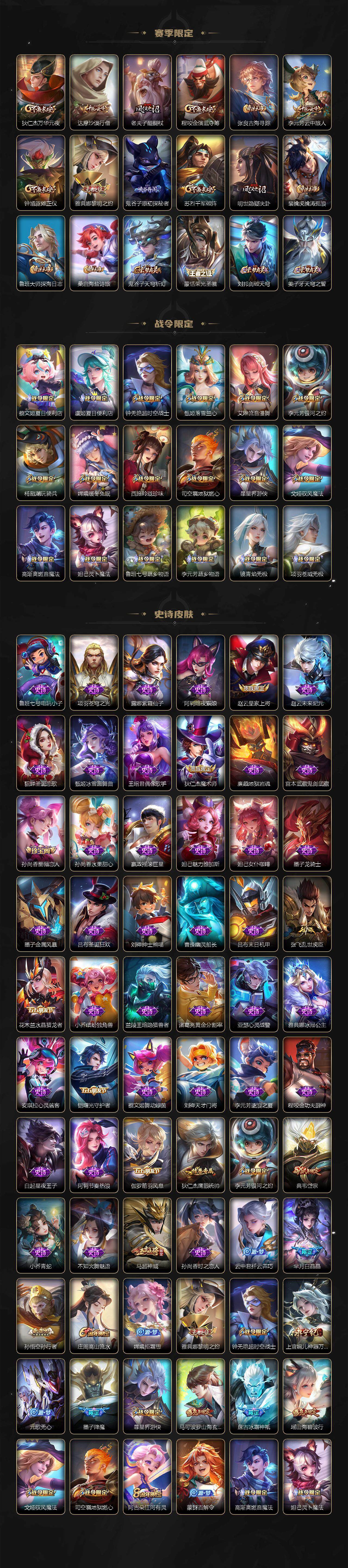 【限定皮肤】:蒙犽顽岩魄,蔡文姬夏日便利店,大乔绒语心约,虞姬夏日便利店,姜子牙天穹之誓,杨戬破阵退雄兵,狄仁杰阴阳师,小乔山海琳琅生,赵云皇家上将,墨子降魔,孙尚香蔷薇恋人,庄周高山流水,钟无艳超时空战士,芈月白晶晶,元歌无心,甄姬落雪兰心,典韦岱宗,马可波罗山海玄木吟,狄仁杰魔术师,狄仁杰万华元夜,达摩沙漠行僧,项羽海滩派对,老夫子醍醐杖,程咬金演武夺筹,孙悟空孙行者,李元芳银河之约,李元芳云中旅人,虞姬启明星使,钟馗驱傩正仪,杨戬潮玩骑兵,雅典娜黎明之约,鬼谷子原初探秘者,苏烈千军破阵,弈星混沌棋,明世隐疑决卦,裴擒虎擒涛扼浪,瑶山海碧波行,云中君纤云弄巧,李信山海炽霜斩,上官婉儿神器万象笔,嫦娥拒霜思,嫦娥暖冬兔眠,曜山海苍雷引,西施玲珑珍味,鲁班大师探海日志,盘古冰霜神祇,桑启海盐诗旅,暃星界游侠,戈娅驭风魔法,艾琳流音漫舞,司空震地狱燃心,阿古朵江河有灵,张良古海寻踪,蒙犽百解令,蒙恬荣光圣徽,高渐离燃音魔法,妲己灵卜魔法,鬼谷子天穹祈灯,姬小满妄想食味,沈梦溪龙舞盛年,鲁班七号蔬乡物语,李元芳蔬乡物语,刘邦剑破天穹,程咬金群星魔术团,镜青焰无极,项羽苍威无极,刘备异域游侠,周瑜熔金海岸