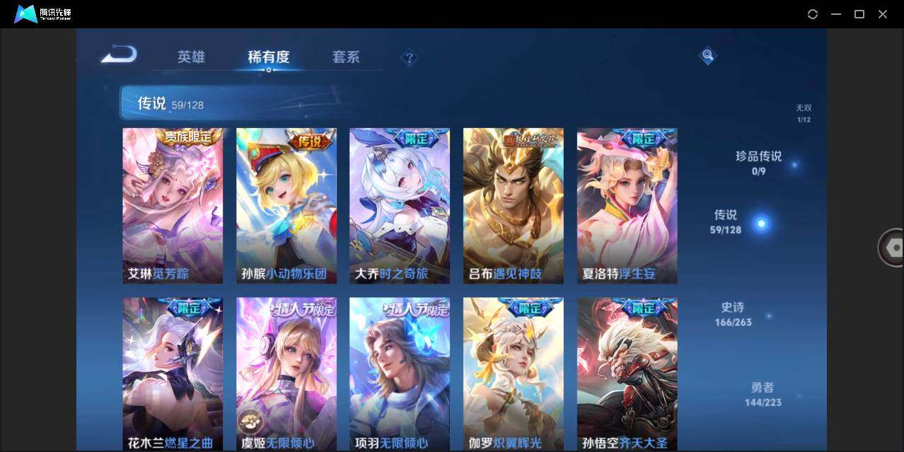 - [11297131]V4 2传说 109英雄 75皮肤 可修改实名 优质装备:黄金狮子座,猫影幻舞 限定皮:至尊宝,梁祝,李小龙 史诗皮:冰冠公主,功夫厨神,乘风破浪,圣诞狂欢,鹰眼统帅,魅力维加斯