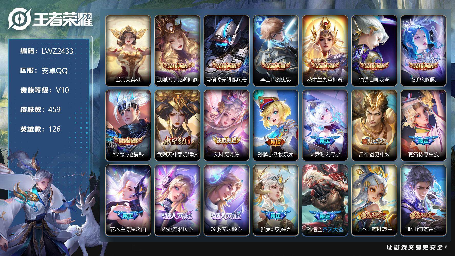 [12152395]游走48段【特价急出/详情看图】:安卓Q-V10-永恒钻石IV段位-126英雄-459皮肤-7典藏-1无双-59传说-164史诗