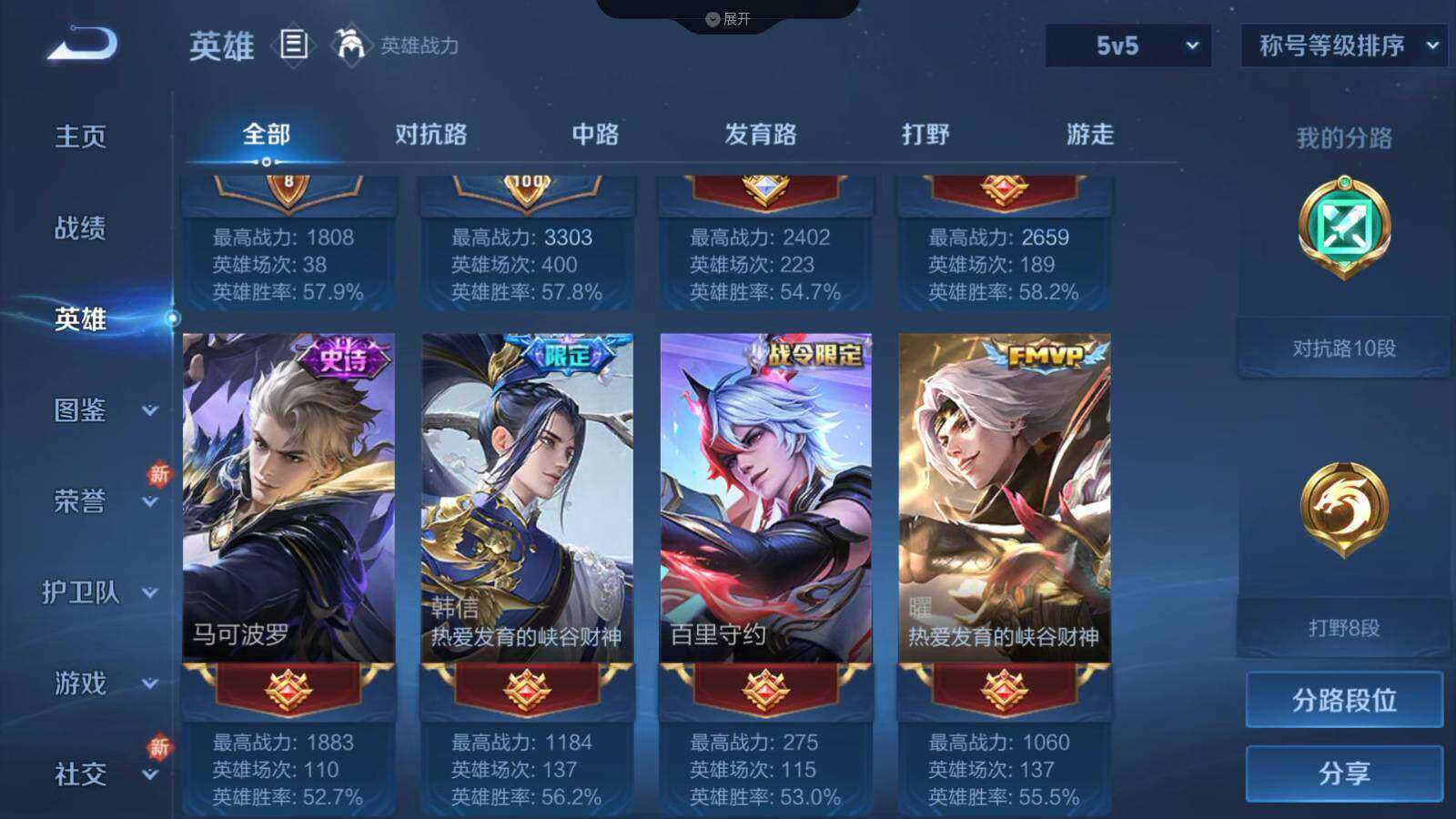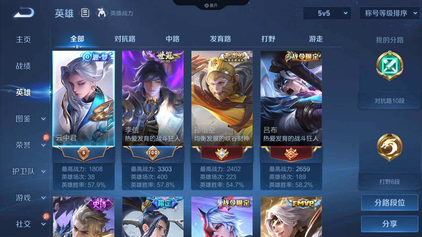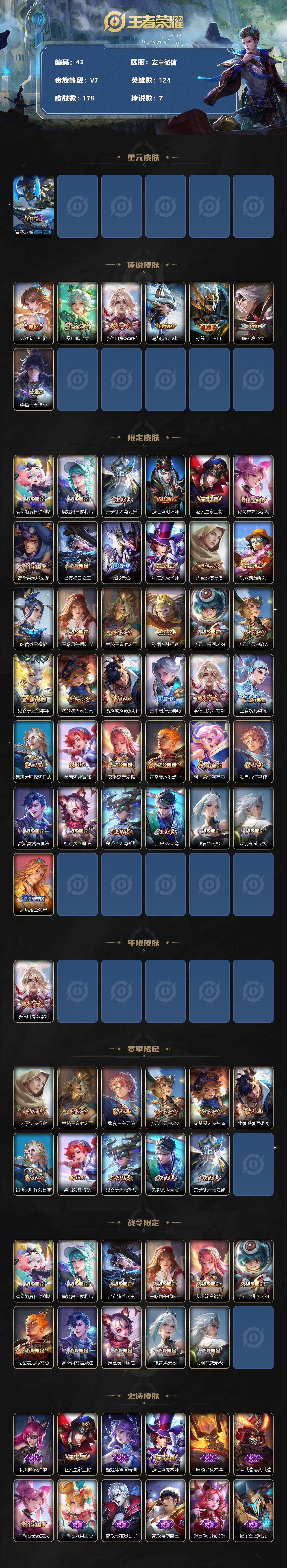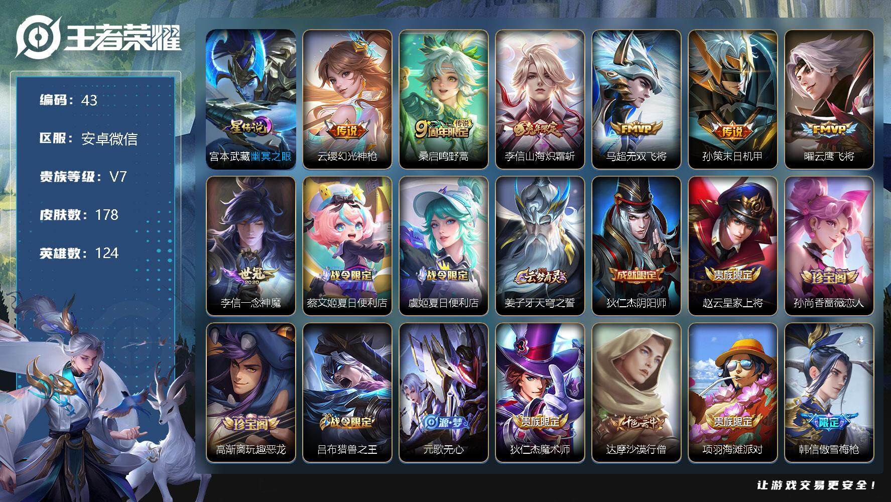 - [12087216]V8 1典藏 1珍品传说 23传说 124英雄 287皮肤 可修改实名 优质装备:弑枪猎影(韩信典藏),黑崎一护,黄金狮子座,云鹰飞将(小将军),炽阳神光,一念神魔,地狱火,地狱之眼,无双飞将,山海·炽霜斩(李信年限),山海·苍雷引(电光曜子),惊梅引 传说皮:乘龙·铭钟鼎(赵云年限),典韦战鼓燎原 珍宝阁皮:优雅恋人,蔷薇恋人,玩趣恶龙 限定皮:愿照·九州拓(澜年限),愿照·山河定(司空震年限),鸣野蒿,至尊宝,傲雪梅枪,时雨天司(水龙头),飞衡(韩信年限),影龙天霄,高山流水,诗剑行,齐天大圣,怒海麟威,五谷丰年,青龙志(铠年限),梁祝,岱宗(典韦年限),李小龙,孙行者,大圣娶亲,引擎之心,寅虎·赤拳(老虎年限),深海之息(深海大菠萝),山海·玄木吟(马可年限) 史诗皮:器灵·浮梦炉,星界战将,龙之律动,石田雨龙,茶境仙,怒海争锋,破空之剑,百相守梦-百里守约,百相守梦-黄忠,紫霞仙子,黄金分割率,特工魅影,千年之狐,江河有灵,百解令(蒙犽),蒙恬荣光圣徽,匿光破解者,偶像歌手,电玩·爆裂旋风,百相守梦(刘备),龙骑士(小龙虾),猫狗日记-孙策,乱世虎臣,节奏热浪,修罗,女仆咖啡,摇滚巨星,水果甜心,星夜王子,功夫厨神,德古拉伯爵,暗隐猎兽者,幽灵船长,鬼剑武藏,暗渊魔法,心灵战警,舞动绿茵,地狱岩魂,拒霜思,乘风破浪,水晶猎龙者,热力回旋,金属风暴,原初追逐者,圣诞恋歌,鹰眼统帅,魅力维加斯,赏金猎手,无心,未来纪元-赵云
