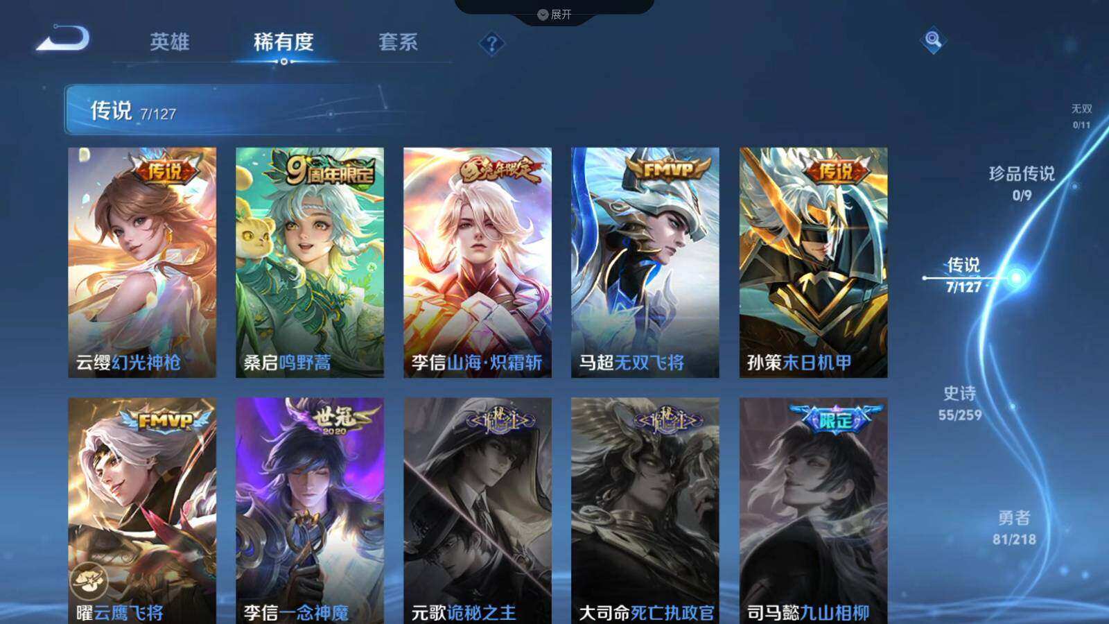 【传说皮肤】:云缨幻光神枪,桑启鸣野蒿,李信山海炽霜斩,马超无双飞将,孙策末日机甲,曜云鹰飞将,李信一念神魔