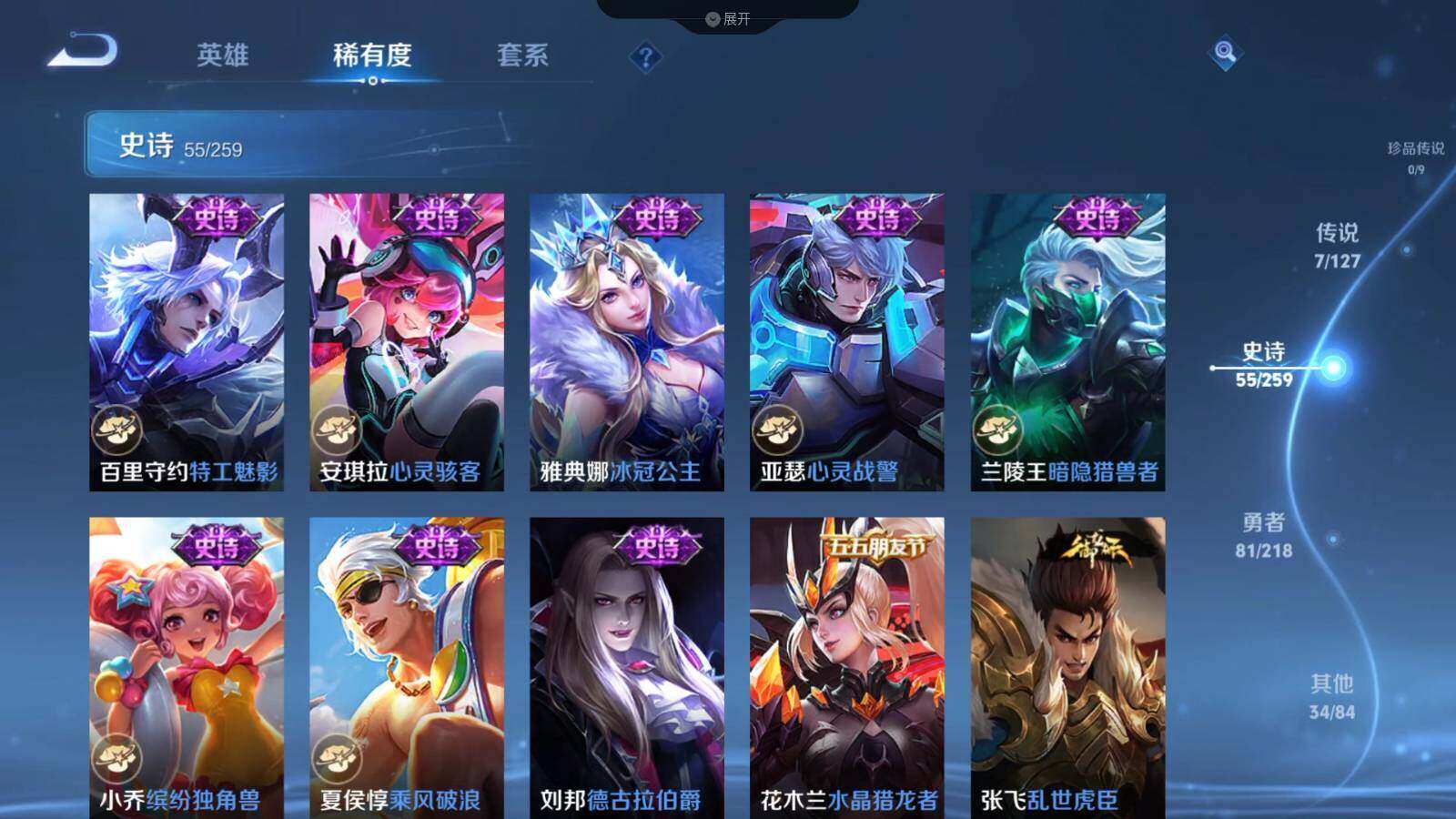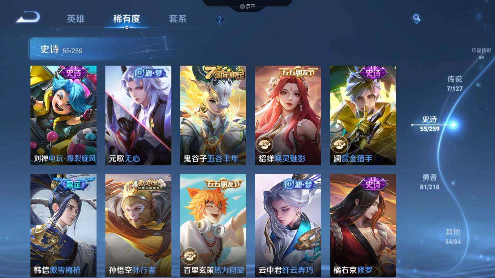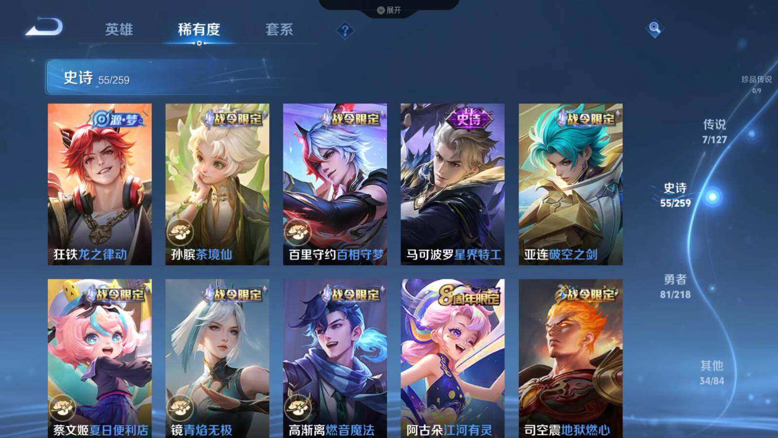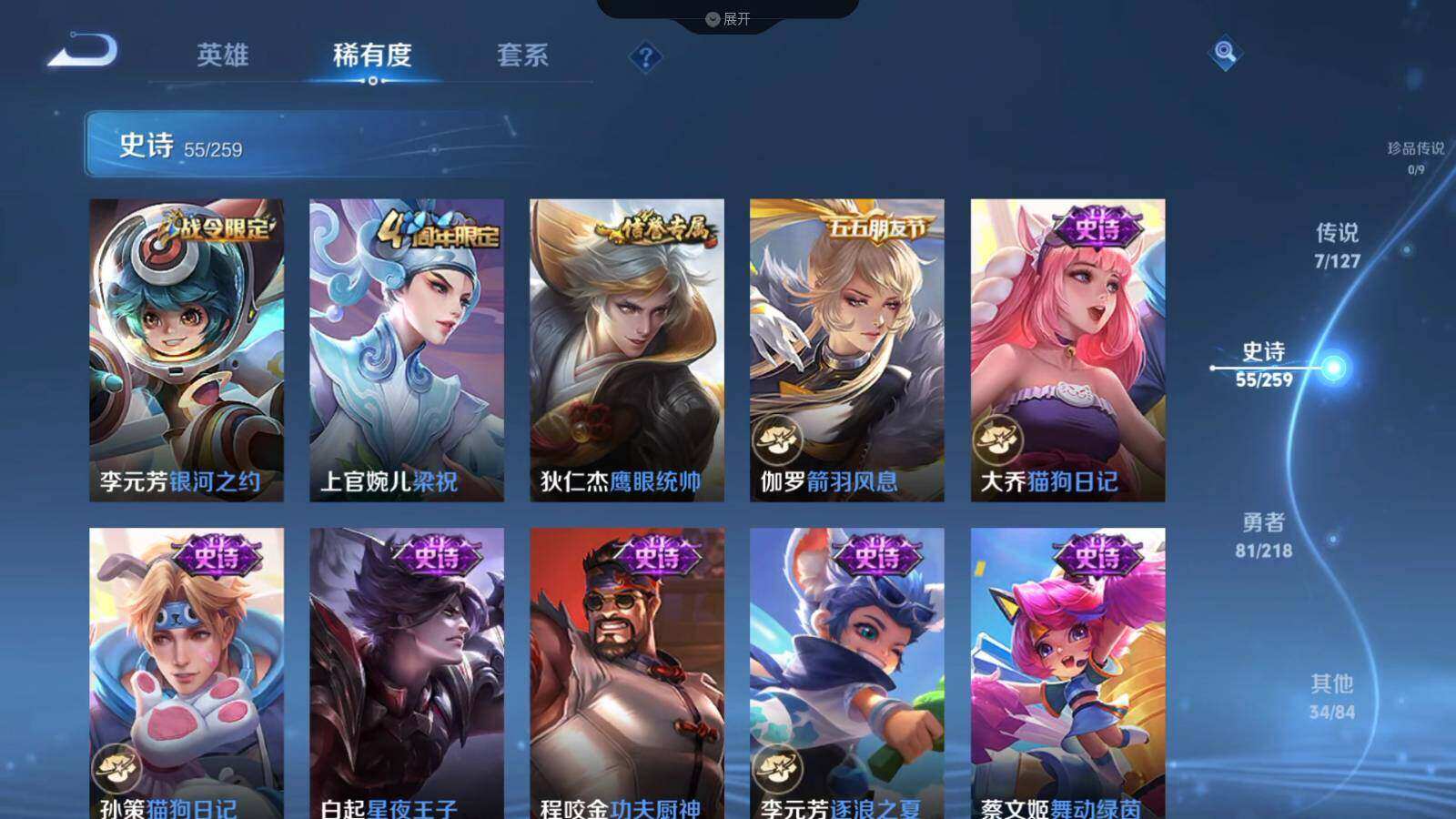 【史诗皮肤】:阿轲暗夜猫娘,赵云皇家上将,甄姬冰雪圆舞曲,狄仁杰魔术师,廉颇地狱岩魂,宫本武藏鬼剑武藏,孙尚香蔷薇恋人,孙尚香水果甜心,嬴政暗夜贵公子,嬴政摇滚巨星,妲己魅力维加斯,墨子金属风暴,吕布圣诞狂欢,曹操幽灵船长,吕布末日机甲,张飞乱世虎臣,花木兰水晶猎龙者,刘邦德古拉伯爵,夏侯惇乘风破浪,小乔缤纷独角兽,兰陵王暗隐猎兽者,亚瑟心灵战警,雅典娜冰冠公主,安琪拉心灵骇客,百里守约特工魅影,蔡文姬舞动绿茵,李元芳逐浪之夏,程咬金功夫厨神,白起星夜王子,孙策猫狗日记,大乔猫狗日记,伽罗箭羽风息,狄仁杰鹰眼统帅,上官婉儿梁祝,李元芳银河之约,橘右京修罗,云中君纤云弄巧,百里玄策热力回旋,孙悟空孙行者,韩信傲雪梅枪,澜赏金猎手,貂蝉唤灵魅影,鬼谷子五谷丰年,元歌无心,刘禅电玩爆裂旋风,司空震地狱燃心,阿古朵江河有灵,妲己灵卜魔法,高渐离燃音魔法,镜青焰无极,蔡文姬夏日便利店,亚连破空之剑,马可波罗星界特工,百里守约百相守梦,孙膑茶境仙,狂铁