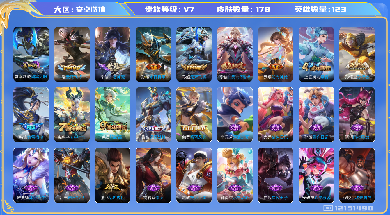 - [11579354]V7 10传说 123英雄 184皮肤 可修改实名 优质装备:黄金狮子座,云鹰飞将(小将军),炽阳神光,一念神魔,时之恋人-刘备(电焊工) 传说皮:典韦战鼓燎原,落雪白狼,铠冥王哈迪斯 珍宝阁皮:蔷薇恋人,女武神 限定皮:愿照·九州拓(澜年限),鸣野蒿,李小龙,孙行者,山海·玄木吟(马可年限) 史诗皮:星界战将,茶境仙,器灵·浮梦炉,龙之律动,百相守梦-黄忠,蒙犽顽岩魄,星界特工,蔬乡物语(鲁班七号),琥珀纪元伽罗,紫霞仙子,特工魅影,永昼,江河有灵,百解令(蒙犽),电玩·爆裂旋风,末日机甲-吕布,猫狗日记-孙策,节奏热浪,女仆咖啡,摇滚巨星,水果甜心,天才门将,心灵骇客,功夫厨神,德古拉伯爵,幽灵船长,鬼剑武藏,地狱岩魂,纤云弄巧,拒霜思,缤纷独角兽,乘风破浪,水晶猎龙者,曙光守护者,原初追逐者,圣诞狂欢,圣诞恋歌,鹰眼统帅,魅力维加斯,未来纪元-赵云