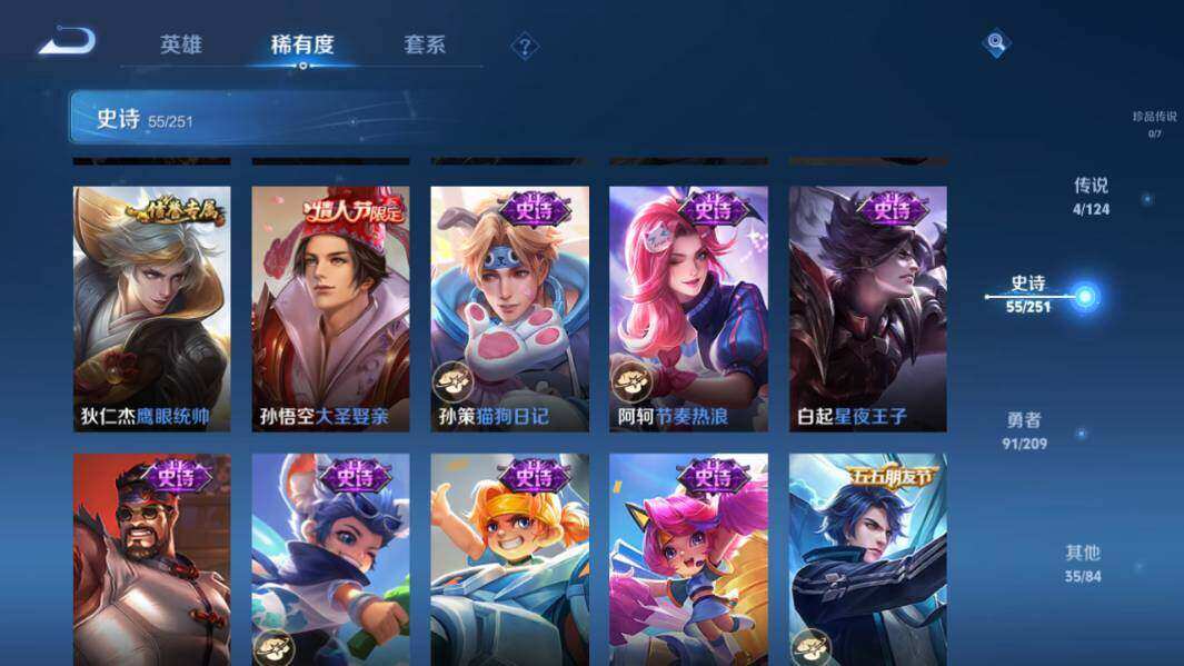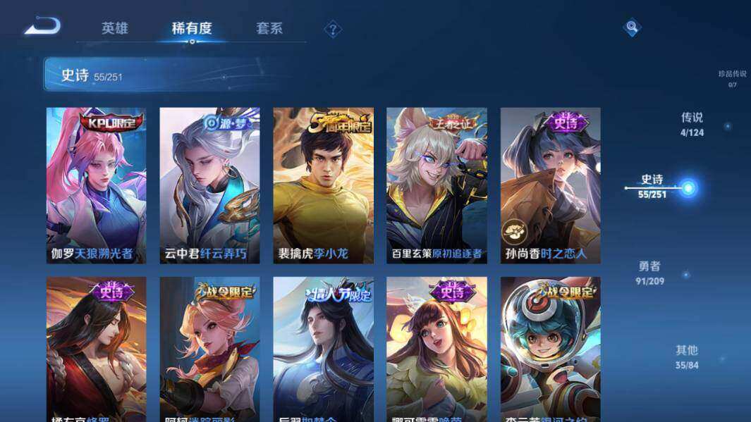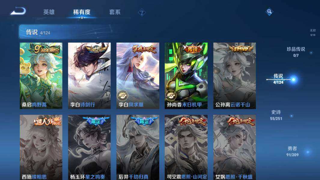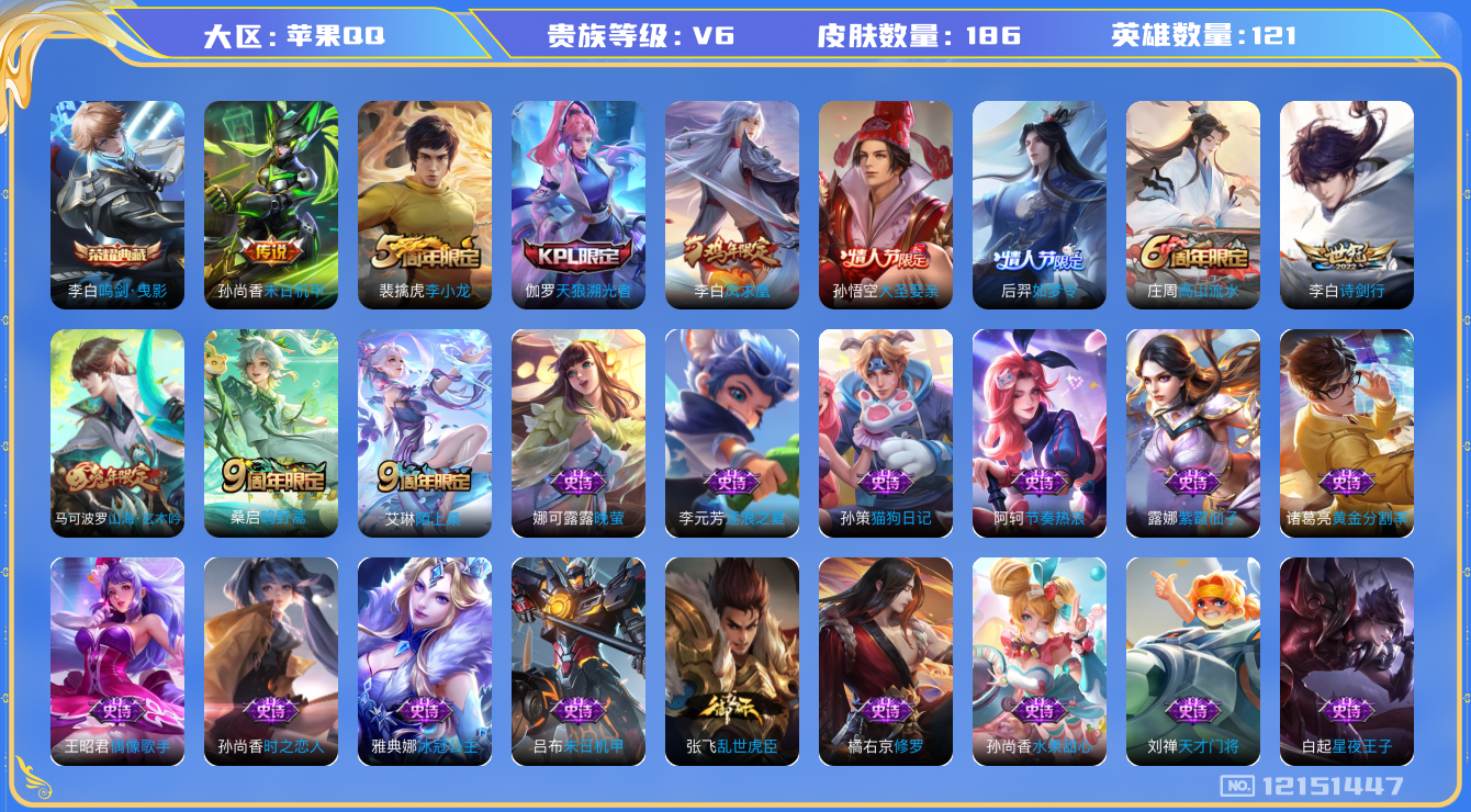 - PX_2083991-贵族等级: V7 英雄数: 125 皮肤数: 209 传说皮: 炽阳神光,一念神魔,零号·赤焰,音你心动-周瑜,山海·苍雷引 限定皮: 李小龙,梁祝,蜜橘之夏,朱雀志,大圣娶亲,高山流水,孙行者,五谷丰年,诗剑行,鸣野蒿