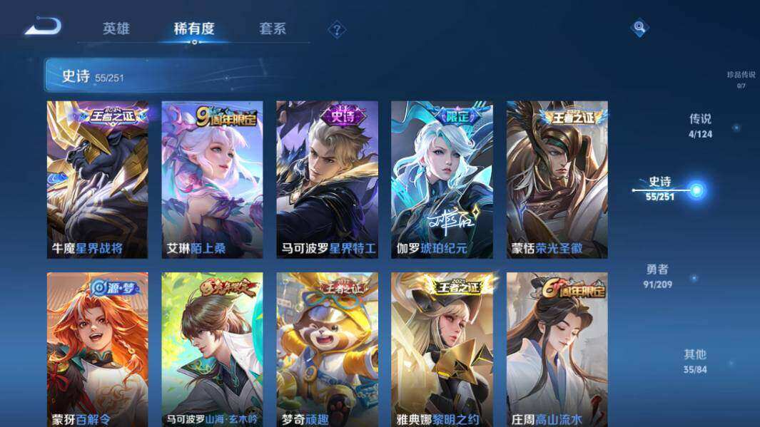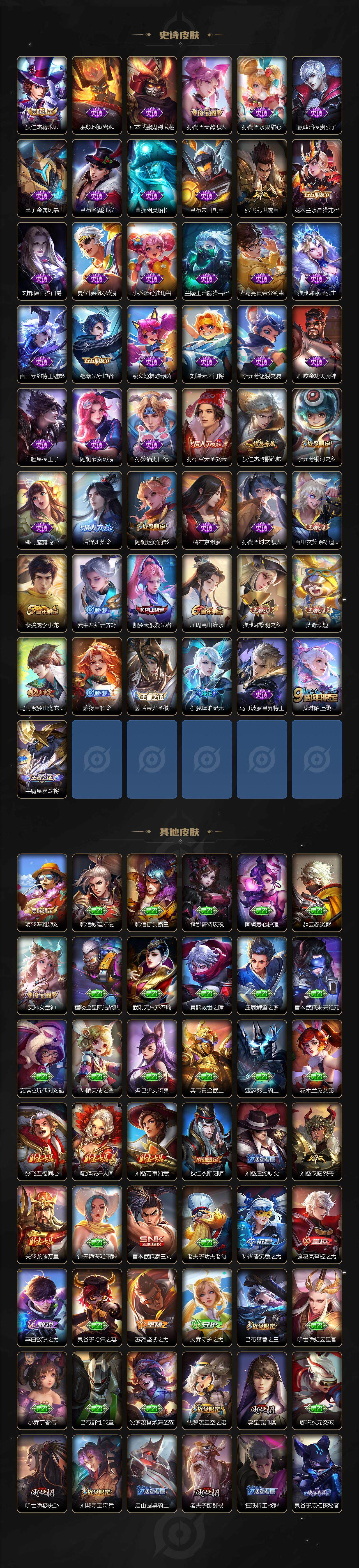 【史诗皮肤】:露娜紫霞仙子,赵云皇家上将,赵云未来纪元,貂蝉圣诞恋歌,甄姬冰雪圆舞曲,王昭君偶像歌手,狄仁杰魔术师,廉颇地狱岩魂,宫本武藏鬼剑武藏,孙尚香蔷薇恋人,孙尚香水果甜心,嬴政暗夜贵公子,墨子金属风暴,吕布圣诞狂欢,曹操幽灵船长,吕布末日机甲,张飞乱世虎臣,花木兰水晶猎龙者,刘邦德古拉伯爵,夏侯惇乘风破浪,小乔缤纷独角兽,兰陵王暗隐猎兽者,诸葛亮黄金分割率,雅典娜冰冠公主,百里守约特工魅影,铠曙光守护者,蔡文姬舞动绿茵,刘禅天才门将,李元芳逐浪之夏,程咬金功夫厨神,白起星夜王子,阿轲节奏热浪,孙策猫狗日记,孙悟空大圣娶亲,狄仁杰鹰眼统帅,李元芳银河之约,娜可露露晚萤,后羿如梦令,阿轲迷踪丽影,橘右京修罗,孙尚