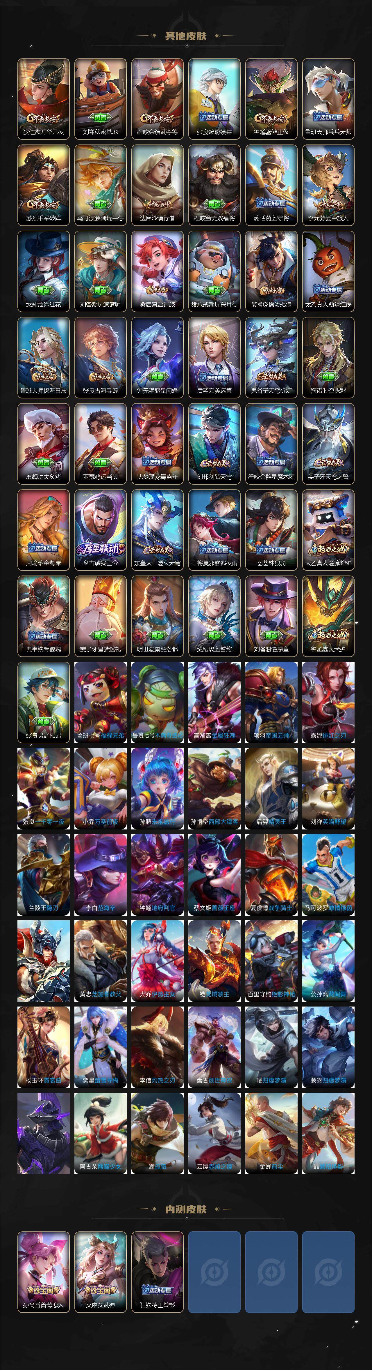 【赛季限定】:狄仁杰万华元夜,达摩沙漠行僧,老夫子醍醐杖,程咬金演武夺筹,张良古海寻踪,李元芳云中旅人,钟馗驱傩正仪,雅典娜黎明之约,鬼谷子原初探秘者,苏烈千军破阵,百里玄策原初追逐者,弈星混沌棋,梦奇顽趣,明世隐疑决卦,裴擒虎擒涛扼浪,鲁班大师探海日志,桑启海盐诗旅,鬼谷子天穹祈灯,蒙恬荣光圣徽,刘邦剑破天穹,姜子牙天穹之誓