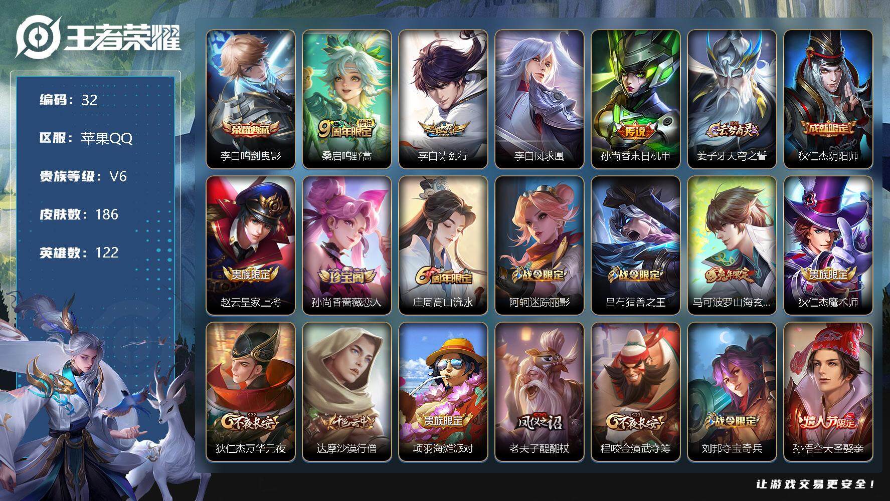 [12151447]MQ719 盘古小国标发育路46段!苹果Q-V6-最强王者段位-122英雄-186皮肤-1典藏-0珍品无双-0无双-0珍品传说-4传说-55史诗 【荣耀典藏】:李白鸣剑曳影 【传说皮肤】:桑启鸣野蒿,李白诗剑行,李白凤求凰,孙尚香末日机甲 【限定皮肤】:姜子牙天穹之誓,狄仁杰阴阳师,赵云皇家上将,孙尚香蔷薇恋人,庄周高山流水,阿轲迷踪丽影,吕布猎兽之王,马可波罗山海玄木吟,狄仁杰魔术师,狄仁杰万华元夜,达摩沙漠行僧,项羽海滩派对,老夫子醍醐杖,程咬金演武夺筹,刘邦夺宝奇兵,孙悟空大圣娶亲,后羿如梦令,李元芳银河之约,李元芳云中旅人,钟馗驱傩正仪,雅典娜黎明之约,鬼谷子原初探秘者,苏烈千军破阵,百里玄策原初追逐者,弈星混沌棋,梦奇顽趣,沈梦溪星空之诺,明世隐疑决卦,裴擒虎李小龙,裴擒虎擒涛扼浪,云中君纤云弄巧,伽罗天狼溯光者,鲁班大师探海日志,桑启海盐诗旅,艾琳女武神,张良古海寻踪,蒙犽百解令,蒙恬荣光圣徽,鬼谷子天穹祈灯,伽罗琥珀纪元,沈梦溪龙舞盛年,刘邦剑破天穹,程咬金群星魔术团,周瑜熔金海岸 【年限皮肤】:李白凤求凰,马可波罗山海玄木吟 【赛季限定】:狄仁杰万华元夜,达摩沙漠行僧,老夫子醍醐杖,程咬金演武夺筹,张良古海寻踪,李元芳云中旅人,钟馗驱傩正仪,雅典娜黎明之约,鬼谷子原初探秘者,苏烈千军破阵,百里玄策原初追逐者,弈星混沌棋,梦奇顽趣,明世隐疑决卦,裴擒虎擒涛扼浪,鲁班大师探海日志,桑启海盐诗旅,鬼谷子天穹祈灯,蒙恬荣光圣徽,刘邦剑破天穹,姜子牙天穹之誓 【战令限定】:阿轲迷踪丽影,吕布猎兽之王,刘邦夺宝奇兵,李元芳银河之约,沈梦溪星空之诺 【史诗皮肤】:露娜紫霞仙子,赵云皇家上将,赵云未来纪元,貂蝉圣诞恋歌,甄姬冰雪圆舞曲,王昭君偶像歌手,狄仁杰魔术师,廉颇地狱岩魂,宫本武藏鬼剑武藏,孙尚香蔷薇恋人,孙尚香水果甜心,嬴政暗夜贵公子,墨子金属风暴,吕布圣诞狂欢,曹操幽灵船长,吕布末日机甲,张飞乱世虎臣,花木兰水晶猎龙者,刘邦德古拉伯爵,夏侯惇乘风破浪,小乔缤纷独角兽,兰陵王暗隐猎兽者,诸葛亮黄金分割率,雅典娜冰冠公主,百里守约特工魅影,铠曙光守护者,蔡文姬舞动绿茵,刘禅天才门将,李元芳逐浪之夏,程咬金功夫厨神,白起星夜王子,阿轲节奏热浪,孙策猫狗日记,孙悟空大圣娶亲,狄仁杰鹰眼统帅,李元芳银河之约,娜可露露晚萤,后羿如梦令,阿轲迷踪丽影,橘右京修罗,孙尚