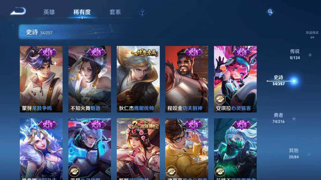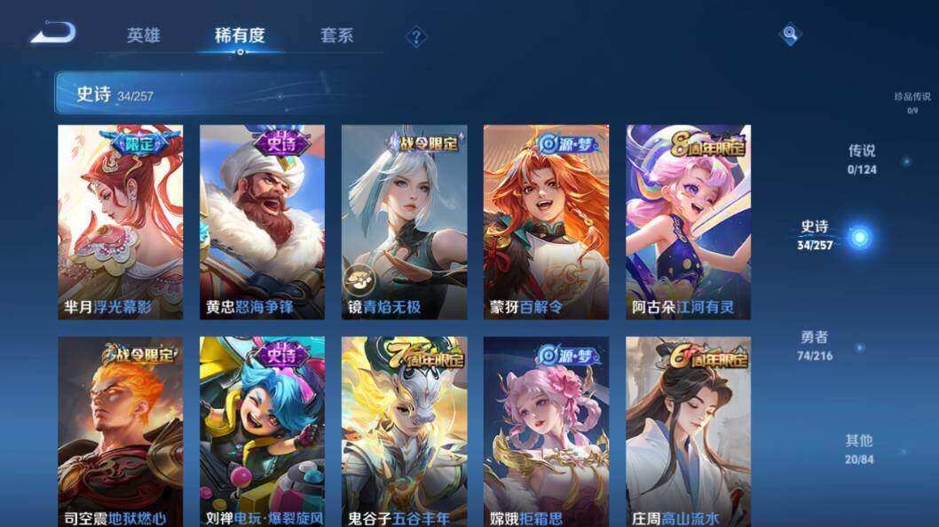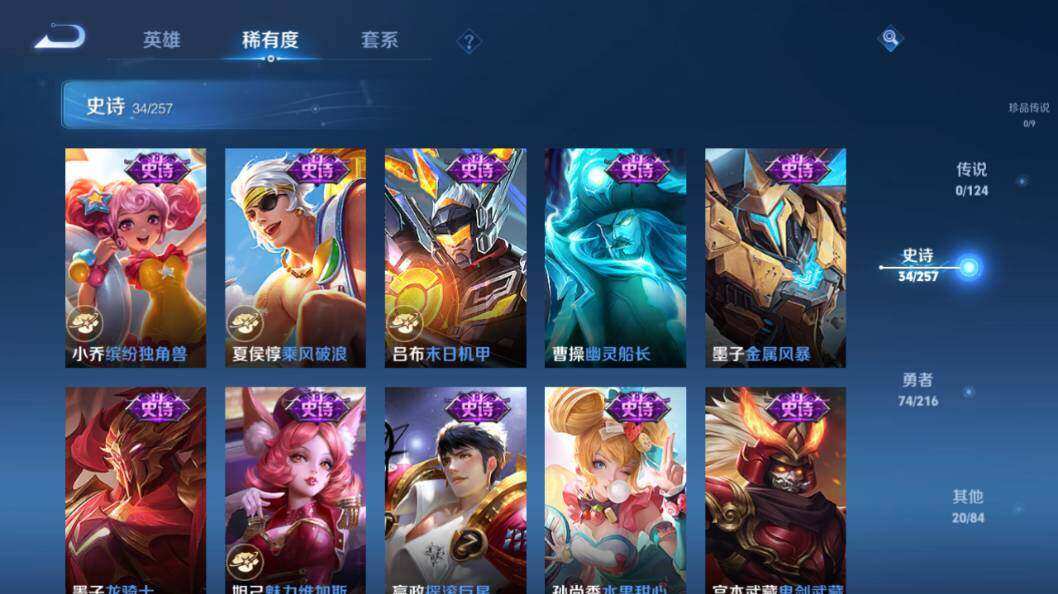 【史诗皮肤】:鲁班七号电玩小子,赵云皇家上将,甄姬冰雪圆舞曲,狄仁杰魔术师,宫本武藏鬼剑武藏,孙尚香水果甜心,嬴政摇滚巨星,妲己魅力维加斯,墨子龙骑士,墨子金属风暴,曹操幽灵船长,吕布末日机甲,夏侯惇乘风破浪,小乔缤纷独角兽,兰陵王暗隐猎兽者,诸葛亮黄金分割率,甄姬游园惊梦,亚瑟心灵战警,雅典娜冰冠公主,安琪拉心灵骇客,程咬金功夫厨神,狄仁杰鹰眼统帅,不知火舞魅语,蒙犽龙鼓争鸣,庄周高山流水,嫦娥拒霜思,鬼谷子五谷丰年,刘禅电玩爆裂旋风,司空震地狱燃心,阿古朵江河有灵,蒙犽百解令,镜青焰无极,黄忠怒海争锋,芈月浮光幕影