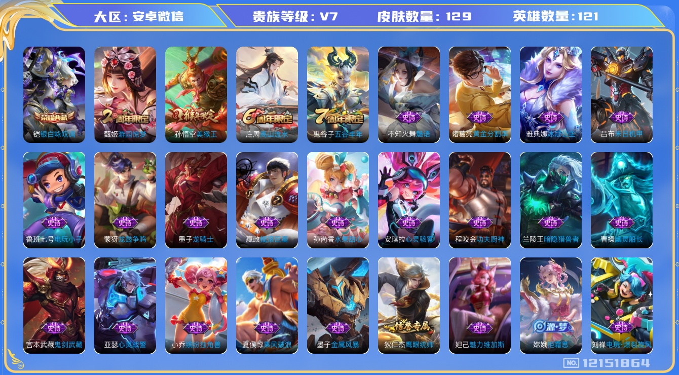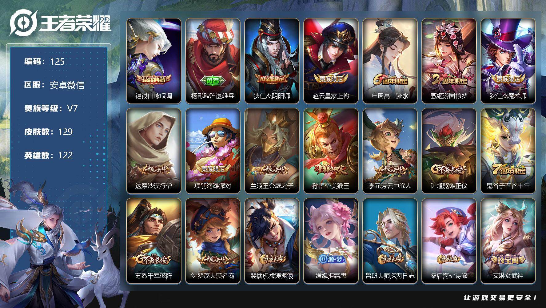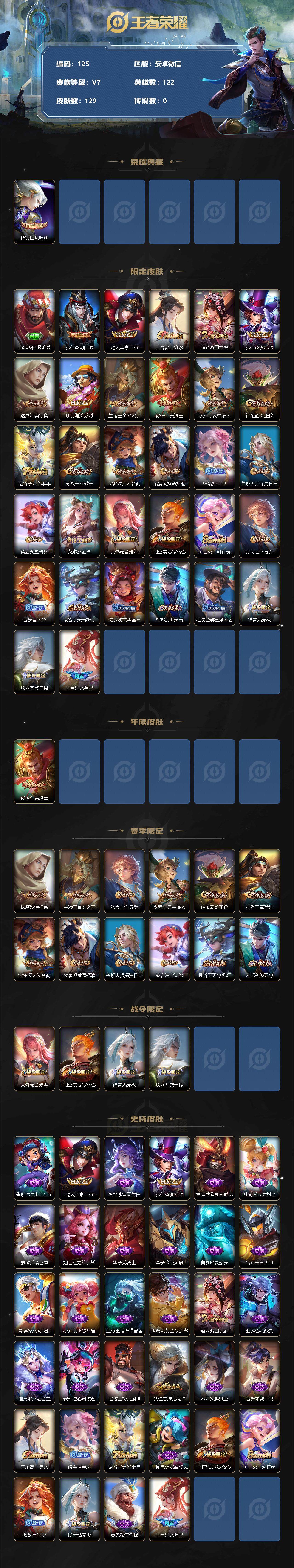 [12151864]AK599 安卓WX-V7-荣耀黄金IV段位-122英雄-129皮肤-1典藏-0珍品无双-0无双-0珍品传说-0传说-34史诗 【荣耀典藏】:铠银白咏叹调 【限定皮肤】:杨戬破阵退雄兵,狄仁杰阴阳师,赵云皇家上将,庄周高山流水,甄姬游园惊梦,狄仁杰魔术师,达摩沙漠行僧,项羽海滩派对,兰陵王金庭之子,孙悟空美猴王,李元芳云中旅人,钟馗驱傩正仪,鬼谷子五谷丰年,苏烈千军破阵,沈梦溪大漠名商,裴擒虎擒涛扼浪,嫦娥拒霜思,鲁班大师探海日志,桑启海盐诗旅,艾琳女武神,艾琳流音漫舞,司空震地狱燃心,阿古朵江河有灵,张良古海寻踪,蒙犽百解令,鬼谷子天穹祈灯,沈梦溪龙舞盛年,刘邦剑破天穹,程咬金群星魔术团,镜青焰无极,项羽苍威无极,芈月浮光幕影 【年限皮肤】:孙悟空美猴王 【赛季限定】:达摩沙漠行僧,兰陵王金庭之子,张良古海寻踪,李元芳云中旅人,钟馗驱傩正仪,苏烈千军破阵,沈梦溪大漠名商,裴擒虎擒涛扼浪,鲁班大师探海日志,桑启海盐诗旅,鬼谷子天穹祈灯,刘邦剑破天穹 【战令限定】:艾琳流音漫舞,司空震地狱燃心,镜青焰无极,项羽苍威无极 【史诗皮肤】:鲁班七号电玩小子,赵云皇家上将,甄姬冰雪圆舞曲,狄仁杰魔术师,宫本武藏鬼剑武藏,孙尚香水果甜心,嬴政摇滚巨星,妲己魅力维加斯,墨子龙骑士,墨子金属风暴,曹操幽灵船长,吕布末日机甲,夏侯惇乘风破浪,小乔缤纷独角兽,兰陵王暗隐猎兽者,诸葛亮黄金分割率,甄姬游园惊梦,亚瑟心灵战警,雅典娜冰冠公主,安琪拉心灵骇客,程咬金功夫厨神,狄仁杰鹰眼统帅,不知火舞魅语,蒙犽龙鼓争鸣,庄周高山流水,嫦娥拒霜思,鬼谷子五谷丰年,刘禅电玩爆裂旋风,司空震地狱燃心,阿古朵江河有灵,蒙犽百解令,镜青焰无极,黄忠怒海争锋,芈月浮光幕影 【其他皮肤】:项羽海滩派对,韩信教廷特使,韩信街头霸王,阿轲爱心护理,达摩大发明家,赵云白执事,赵云忍炎影,芈月红桃皇后,艾琳女武神,程咬金星际陆战队,白起白色死神,牛魔西部大镖客,扁鹊化身博士,庄周鲤鱼之梦,宫本武藏未来纪元,孙膑天使之翼,姜子牙时尚教父,亚瑟死亡骑士,达摩拳王,孙悟空美猴王,花木兰兔女郎,张飞五福同心,甄姬花好人间,刘备万事如意,后羿阿尔法小队,狄仁杰阴阳师,刘备纽约教父,刘备汉昭烈帝,王昭君幻想奇妙夜,狂铁命运角斗场,老夫子功夫老勺,孙尚香沉稳之力,苏烈坚韧之力,明世隐虹云星官,小乔丁香结,吕布野性能量,孙膑归虚